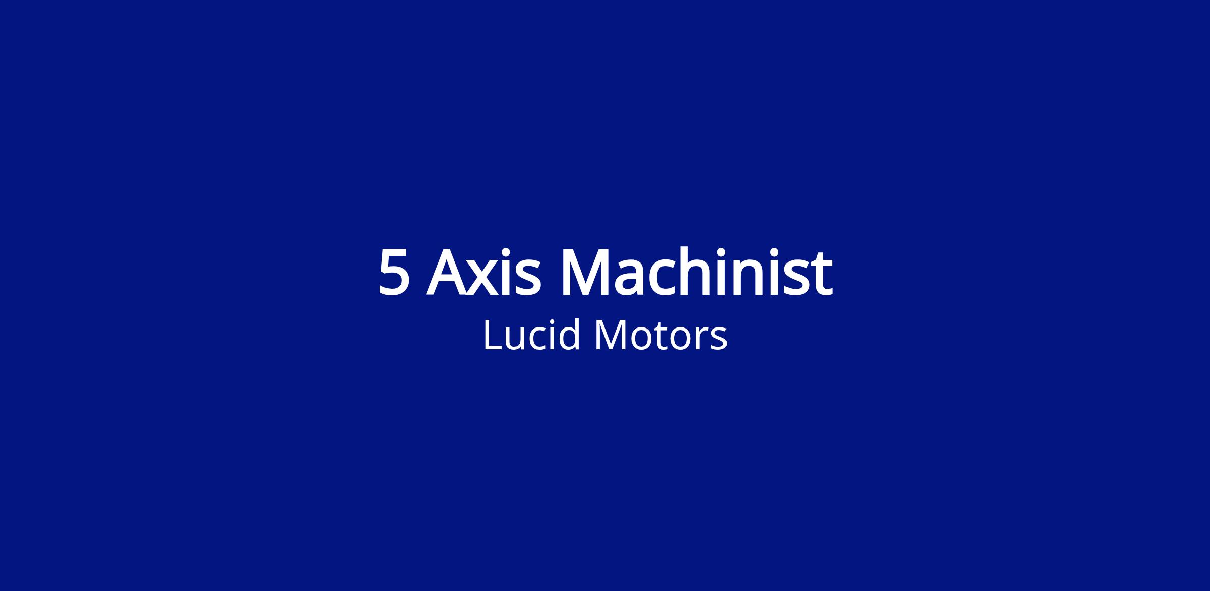Lucid Motors is seeking a highly motivated 5-Axis Machinist, Vehicle Integration with an understanding of fundamental shop knowledge. This position will report to the Maintenance Manager. The ideal candidate is extremely hands-on with solid experience in CNC machining.