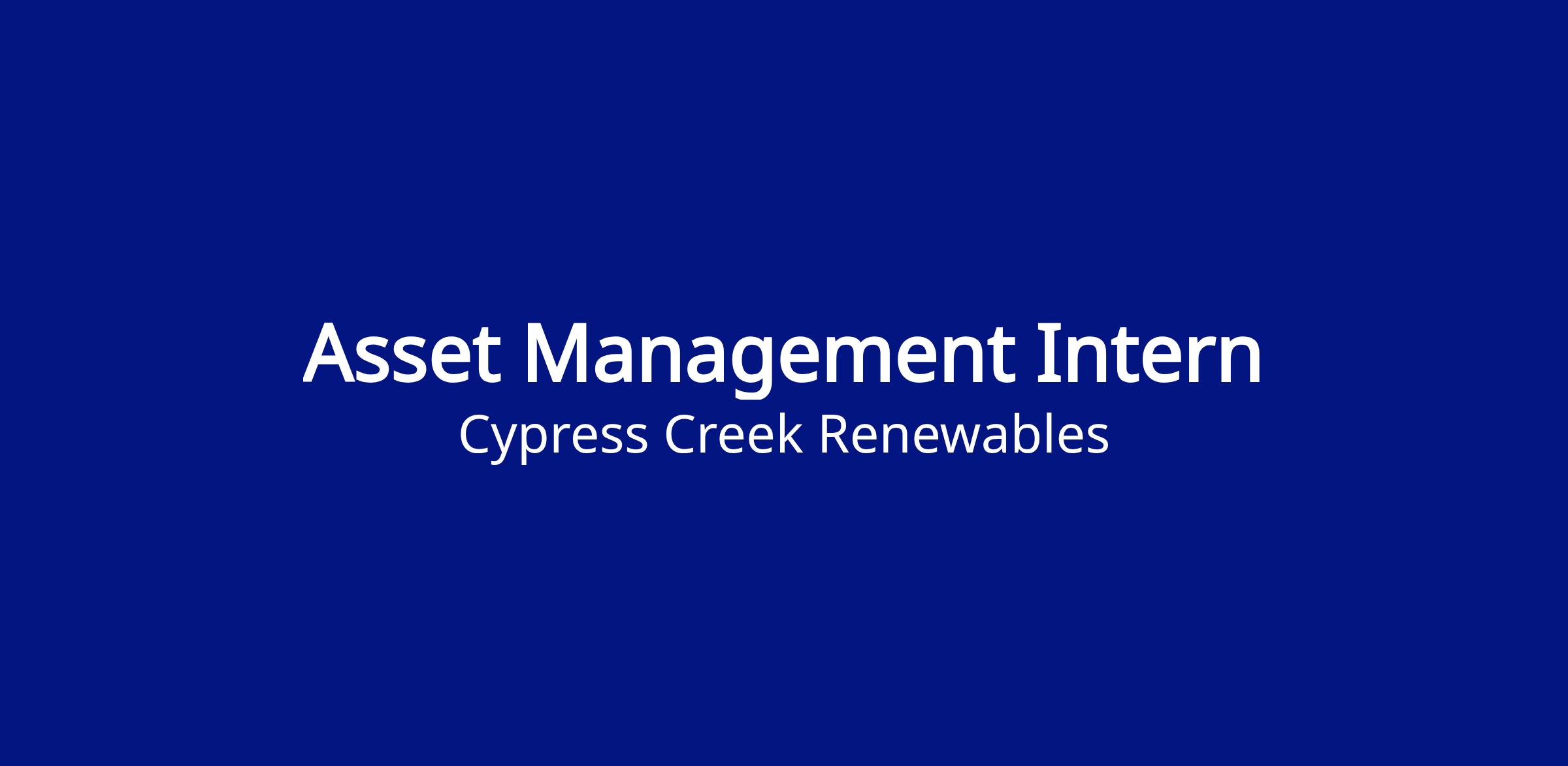 Cypress Creek Renewables is seeking a highly motivated intern to help support the Solar Asset Management team.  The Asset Management team acts as the internal owner of the solar projects that CCR owns. This group plays a pivotal part in ensuring the long-term value and day-to-day performance of designated operating assets, and is at the intersection of operational, regulatory, financial, commercial, risk management, legal and investor matters in CCR’s Fleet.