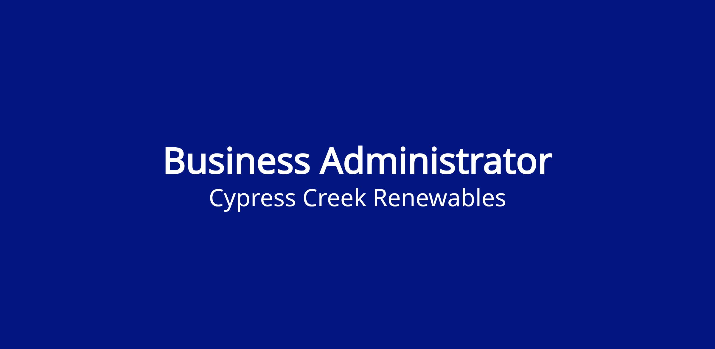 Cypress Creek Renewables is seeking a motivated candidate for a Business Administrator position in the renewable energy industry. This position would support multiple Development teams on projects located across the country. As a Business Administrator supporting Cypress Creek projects, this position balances sound internal communication with coordinating and documenting development activities using cloud-based document management and project information databases and reporting tools. An effective candidate will demonstrate comprehensive attention to detail, superior organization, a desire to efficiently solve problems, enthusiastic initiative, effective communication skills and an ability to work with others across multiple teams.