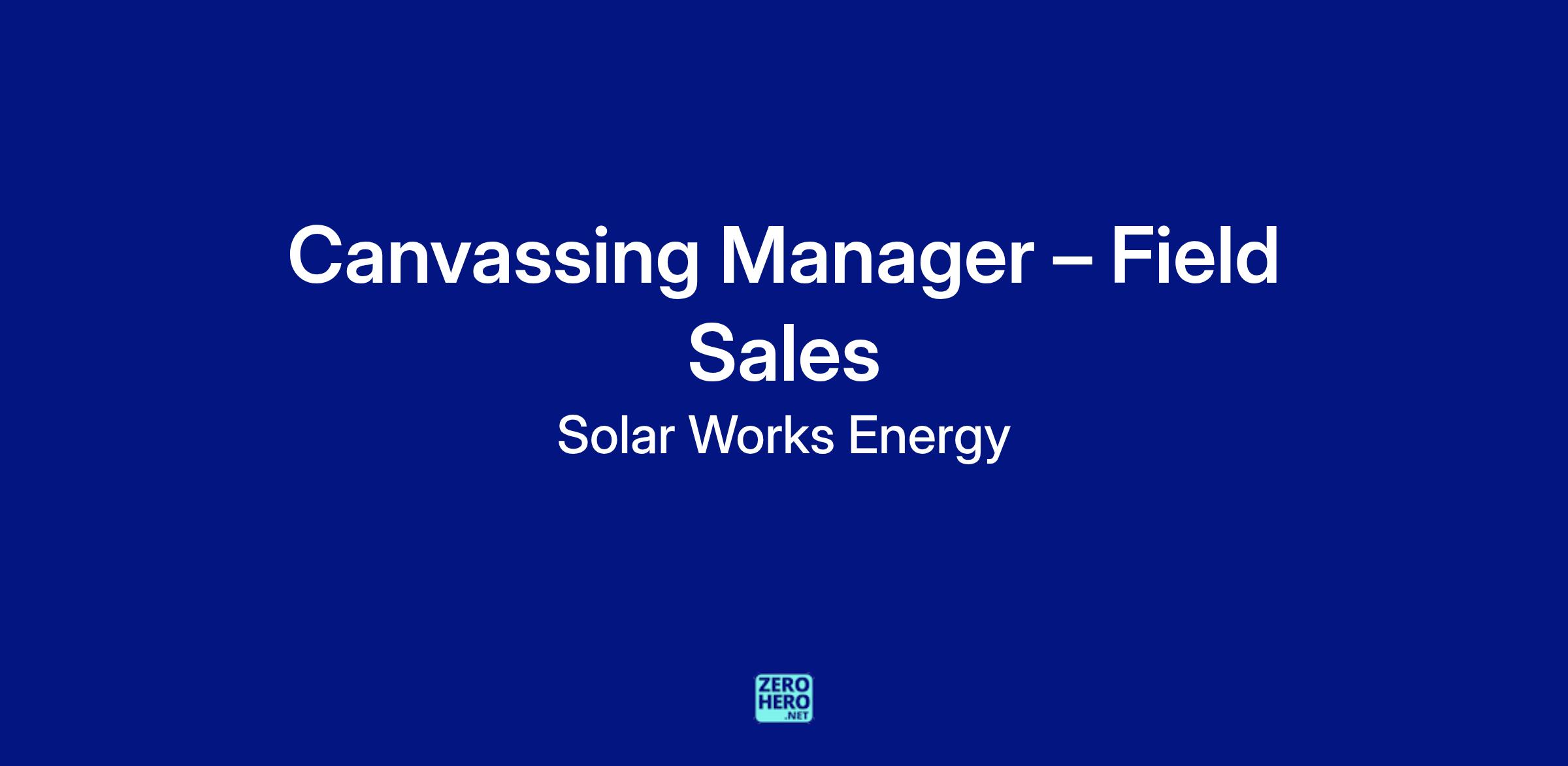 Solar Works Energy<\/b> <\/span>is seeking an experienced and driven <\/span>Canvassing Manager<\/b> <\/span>to lead a high -performing field sales team in residential solar. This is a field -based leadership role requiring a mix of <\/span>door -to -door sales skills, team management, and performance accountability<\/b>.