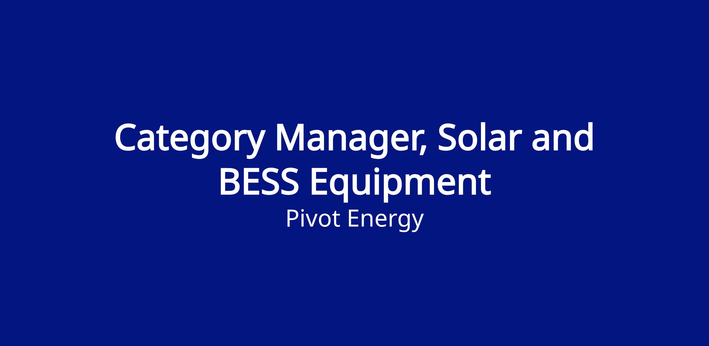 As the Category Manager, Solar and BESS Equipment, you will lead Solar PV and Energy Storage sourcing activities & supplier management to implement opportunities to improve cost, quality, delivery, and reliability to reach organizational goals. This role will shape Pivot Energy’s category management strategy by developing processes and procedures that will ensure best practices for key equipment categories. This position will report to the Sr. Director, Procurement.