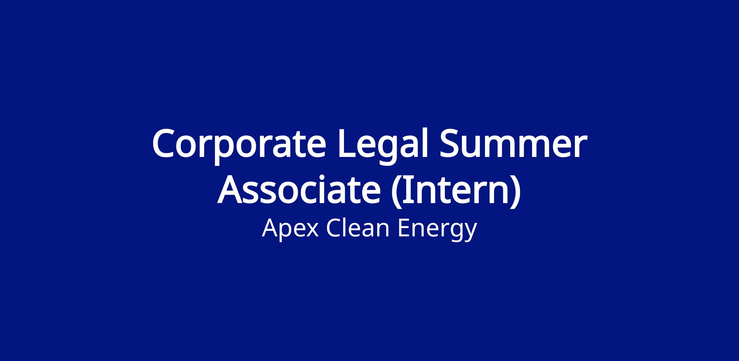Apex Clean Energy is seeking law students to work with our Corporate Legal Team as summer associates. Experience with our legal teams offer an excellent way to learn about the legal transactions related to the development, financing, construction, and operation of utility-scale renewable energy projects.