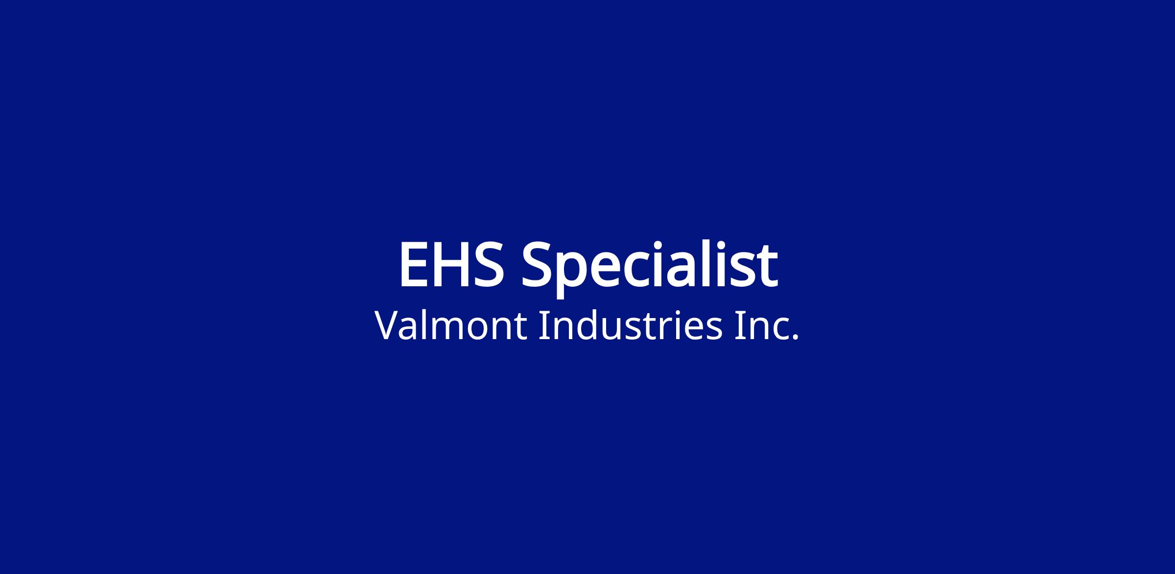 This position serves as Valmont’s Environmental, Health & Safety (EHS) Specialist, enabling overall company strategy in driving continuous improvement with EHS best practices across the organization. This position requires individual initiative on special projects to complete a wide variety of tasks that are part of Valmont’s comprehensive EHS initiatives. This includes participating in and facilitating the site level EHS teams and initiatives. The position will support implementation of Valmont’s EHS Playbook for the site. The EHS Specialist facilitates the alignment of the site’s EHS activities with Valmont’s overall enterprise wide EHS strategies. The incumbent is responsible to swiftly detect sub-standard EHS performance using leading and lagging indicators and take action in conjunction with appropriate site and regional leadership teams. It is critical that the EHS Specialist assists others in their growth and knowledge in Safety, Health & Environmental practices. It is expected that the EHS Specialist interacts with site production employees to identify and control hazards that can result in harm.