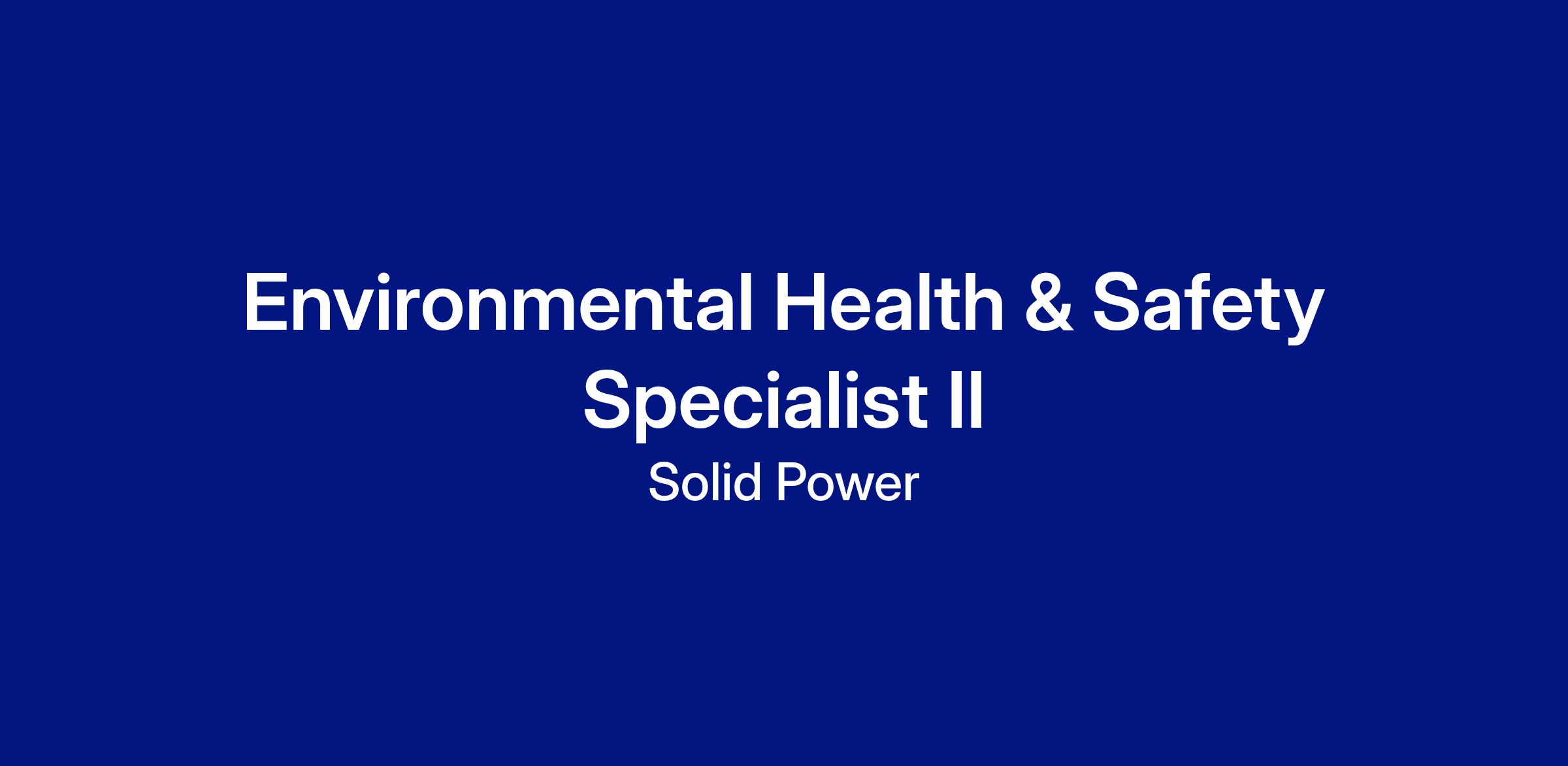 Join our talented team of engineers and scientists working to revolutionize the battery industry through the development of next‐generation, all solid‐state electrolyte powder & rechargeable batteries. Solid Power is a dynamic, fast‐paced, collaborative and innovative team environment. We are seeking an EHS Specialist II to support and advance site Environmental, Health, and Safety programs in our chemical battery manufacturing operations. This role provides ownership of hazardous waste management, regulatory compliance, and safety culture initiatives. The ideal candidate will bring technical expertise, certifications, and leadership in program administration, training, and audit readiness to ensure operational discipline and regulatory defensibility.