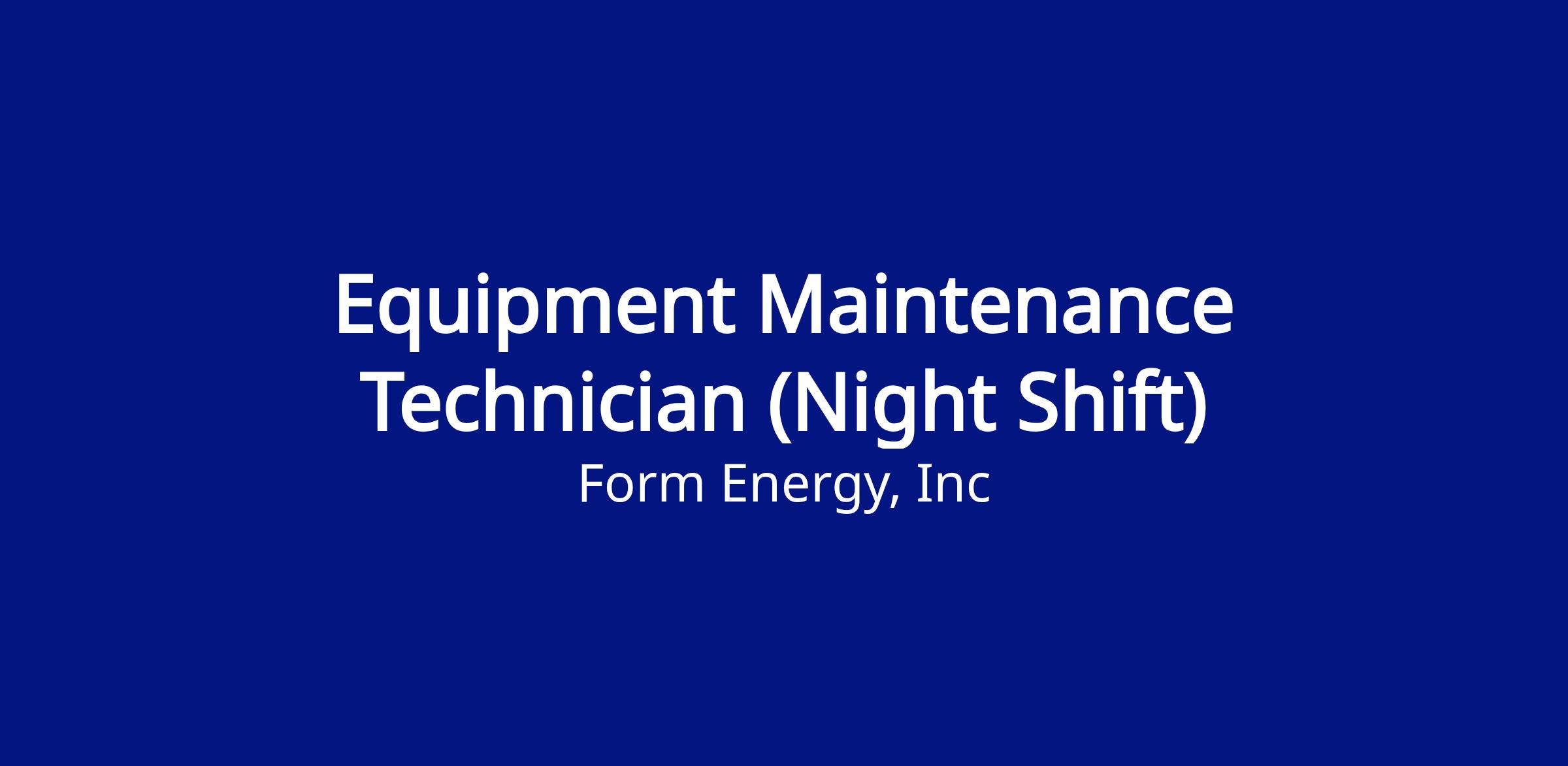 We are looking for an Equipment Maintenance Technician, to support our manufacturing and factory build operations. This person will be responsible for making sure our equipment runs smoothly and supporting our technical operations. The ideal candidate will be able to independently execute day-to-day operations and maintenance activities as well as be willing to roll up their sleeves to quickly tackle facility service and repair issues. Reporting to the Maintenance Manager, this person will work closely with all members of the Form Energy team.