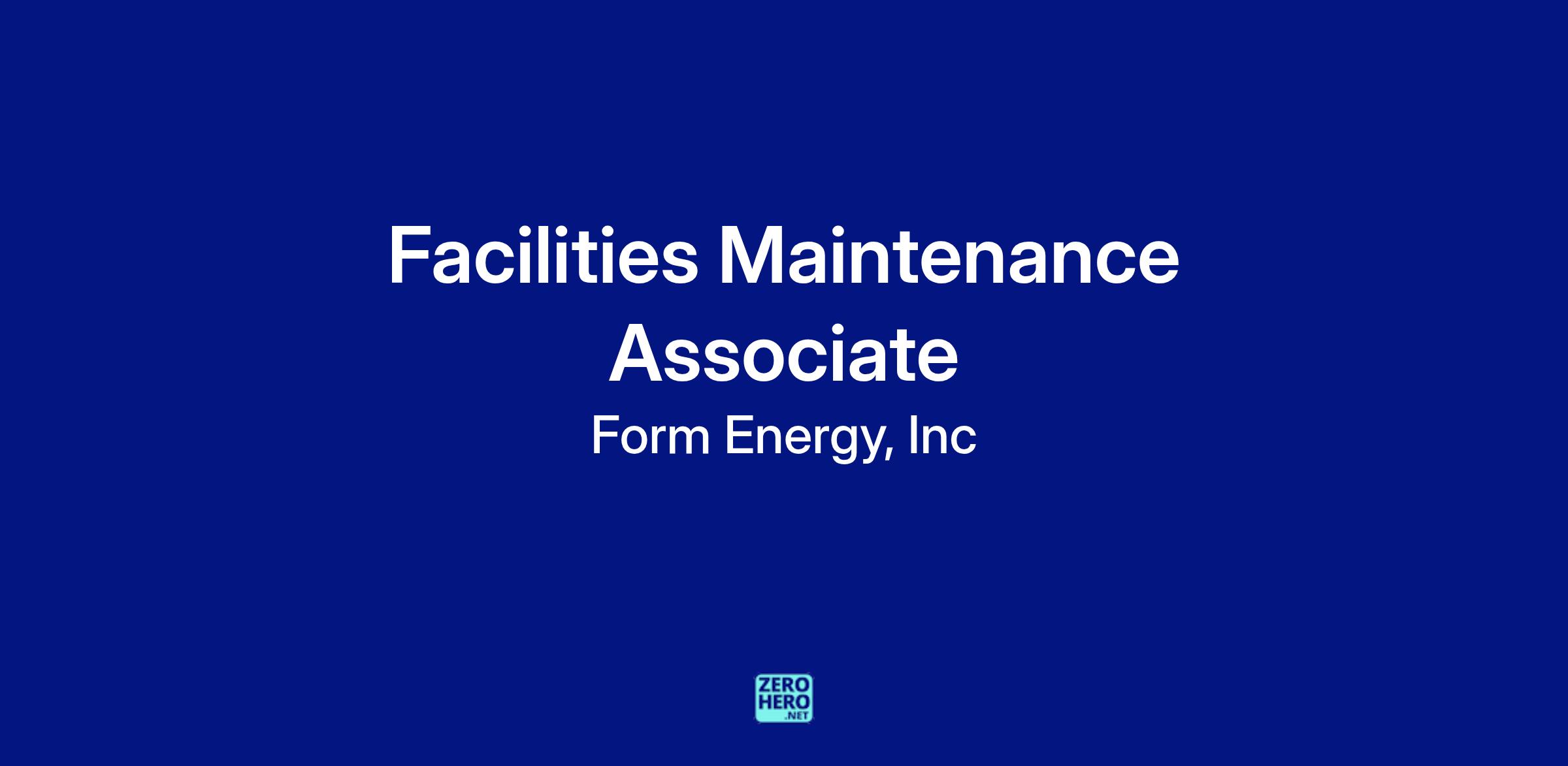 We are looking for a Facilities Maintenance Associate to support our lab and office operations, ultimately helping Form Energy continue to be a great and safe place to work. You will make sure our facility runs smoothly and support our technical operations. You’ll interact with many teams, independently execute day-to-day operations and maintenance activities, and roll up your sleeves to quickly tackle facility management issues. Come join us and be part of the growth of a fast-moving technology start-up with breakthrough technology and an incredible mission!