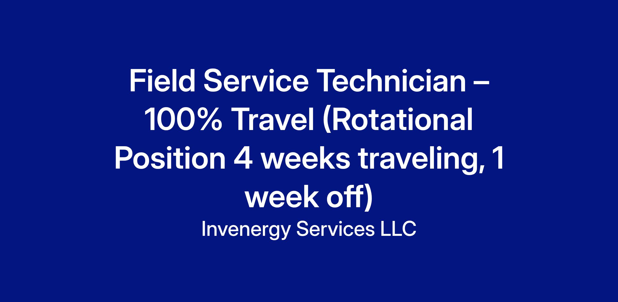 As a Field Service Technician – 100%, you will be responsible for performing and training on major component replacements and repair services as needed across the Invenergy fleet. Assure all operations and maintenance activities are performed in a safe manner consistent with established Invenergy policies and procedures. You should expect to travel away from home for 4-week intervals while returning home for a week of time off.