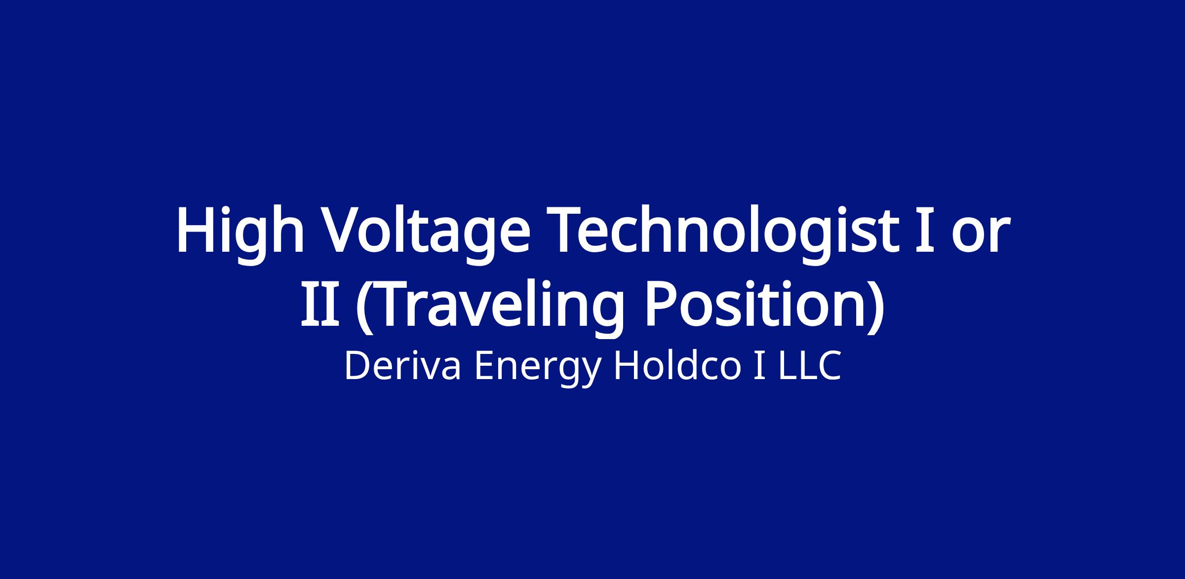 Deriva Energy, a portfolio company of Brookfield Renewable U.S., who is a nationwide leader in sustainable energy provides wind, solar, resilient backup power, and managed energy services to over 1,000 projects across the U.S., with a total electric capacity of more than 5,100 megawatts of nonregulated renewable energy. Our Renewables Technologists (High Voltage Technicians) are a vital part of our organization, and we take pride in hiring and training the best in the industry. We are looking for motivated, High Voltage Technicians to travel the country maintaining and repairing high and medium voltage equipment.