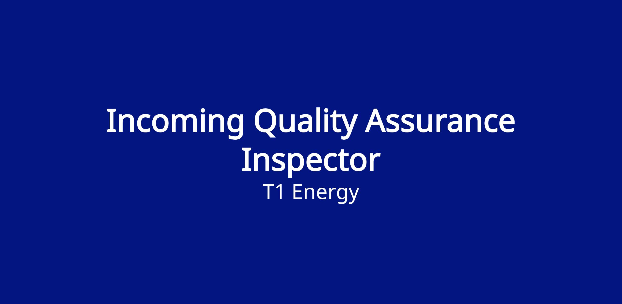 T1 Energy is looking to hire an experienced IQA (Incoming Quality Assurance) Inspector to join our team in the Manufacturing industry. Under the direction of the Quality Specialist, will inspect, perform lab testing, and collect data on all required raw incoming materials.