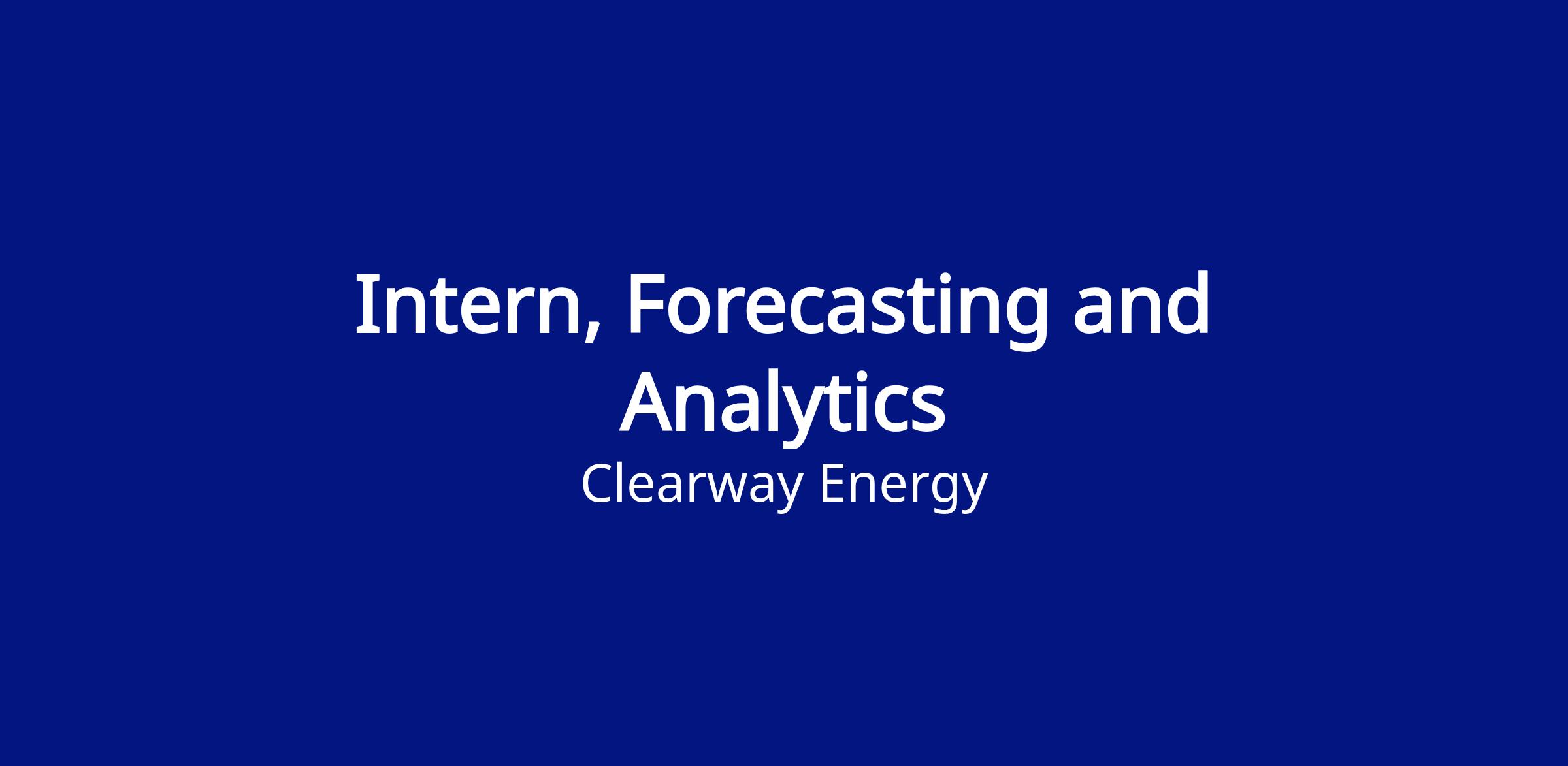 The Forecasting & Analytics Intern will be part of Clearway's Data Analytics team within Asset & Energy Management, helping us unlock the power of predictive analytics across our renewable energy portfolio.