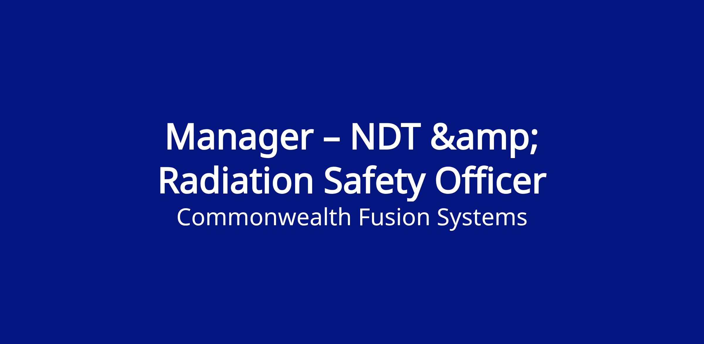The Manager of NDT and Industrial RSO is the technical owner of NDT Operations and industrial radiography radiation safety at CFS. This role is responsible for developing and maintaining the organization's NDT capabilities to ensure successful delivery of SPARC and to prepare for the future scaling for ARC power plants.