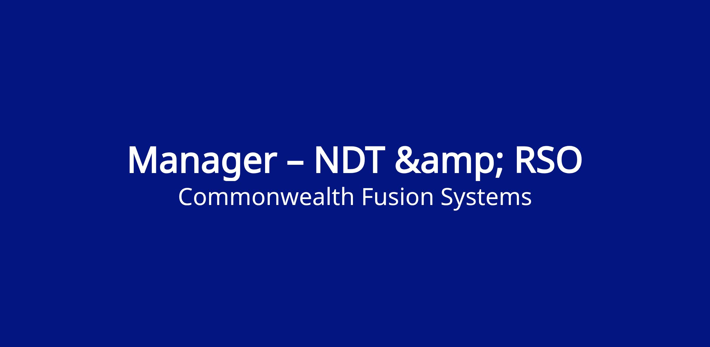 The Manager of NDT and Industrial RSO is the technical owner of NDT Operations and industrial radiography radiation safety at CFS. This role is responsible for developing and maintaining the organization's NDT capabilities to ensure successful delivery of SPARC and to prepare for the future scaling for ARC power plants.