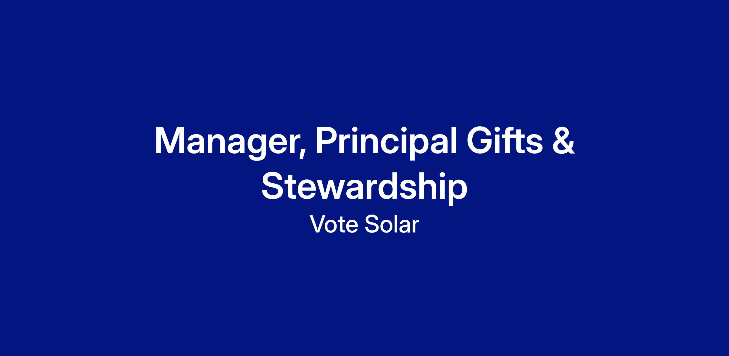 The Manager of Principal Gifts & Stewardship will play a key role in assisting the Chief Philanthropy Officer (CPhO) and other members of the Senior Leadership Team in managing the organization’s principal donors and prospects. Reporting directly to the CPhO, this role will create highly personalized impact reports, bespoke stewardship plans, and persuasive cultivation materials. They will be responsible for managing prospects and moves management in collaboration with the Executive Director and Chief Programs Officer, and for developing cases for support that accurately and effectively showcase Vote Solar's positive impact to ensure the continuation and growth of funding.