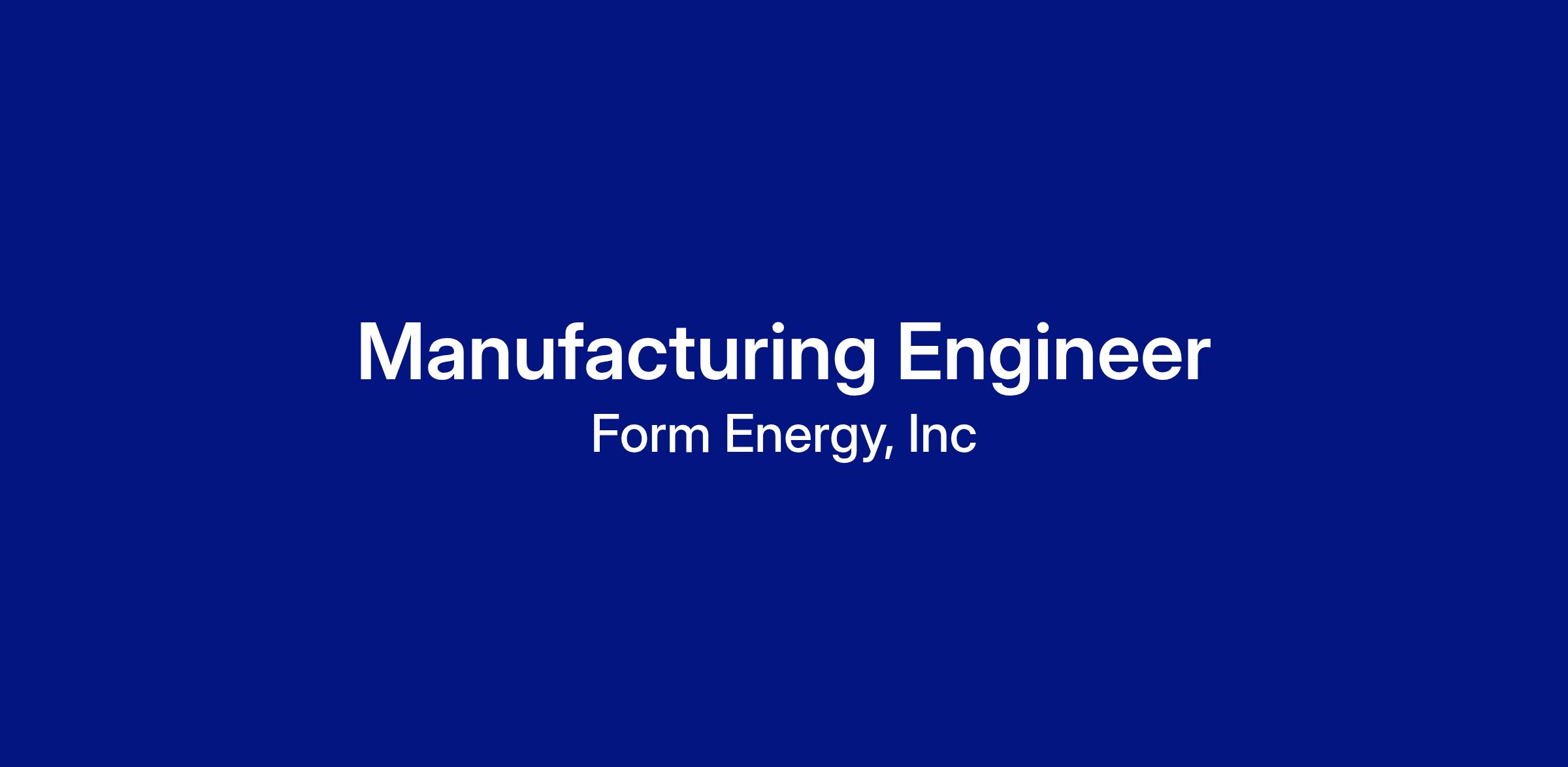Form Energy is looking for motivated Manufacturing Engineers passionate about deploying and scaling manufacturing systems. This is an exciting opportunity to design and build a new class of battery manufacturing. In this role, you will conceptualize, design, deploy and ramp various manufacturing stations & lines.