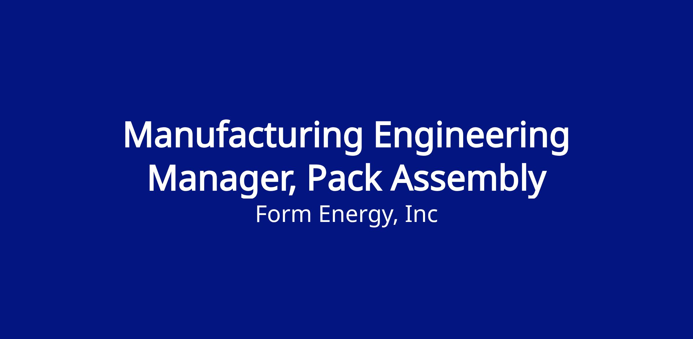Form Energy is hiring a Manufacturing Engineering Manager to lead our pack assembly area. In this pivotal role, you will bridge the gap between initial product design and high-volume production, overseeing the entire lifecycle of battery module and pack assembly processes. You will be responsible for building and mentoring a high-performing engineering team while spearheading the procurement and commissioning of cutting-edge manufacturing equipment.