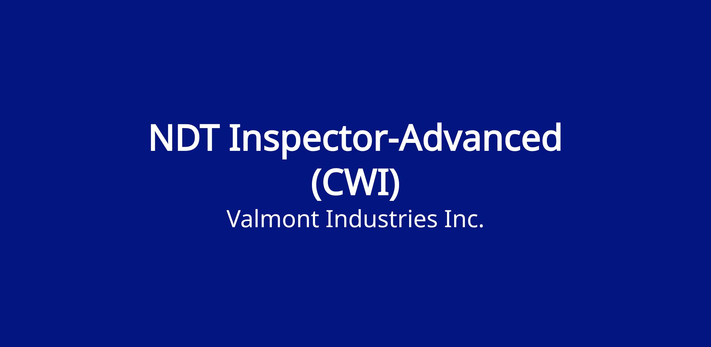 This position reports to the Quality Supervisor or Quality Manager. The NDT Inspector – Advanced will evaluate the assembly of fabricated materials by dimensional checks, visual inspection of welds and conduct nondestructive testing by ultrasonic, mag particle, and liquid penetrant processes. Responsible for coordination of the Quality area to meet production goals. Completes daily paperwork. Describe Valmont’s quality system and demonstrate inspection proficiency for customer and third party auditors. Demonstrates a commitment to quality, productivity, safety and environmental policies. Responsible for communication within the work group ensuring teamwork and a productive work environment. Working with the production supervisor to maintain workflow of the area and report issues to the supervisor. Perform nondestructive examination (NDE) on material using methods including: visual, magnetic partial, liquid penetrant, and ultrasonic testing. Evaluate examination results and determine if material meets contract specifications. Responsible for generating and maintaining NDT reports and records for company and contractors.