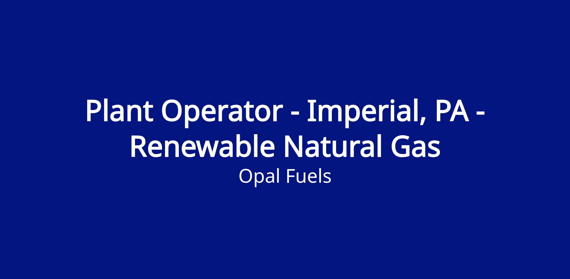 We are hiring for a Plant Operator to work in our Operations department. This position reports to a Lead Plant Operator and is located in Imperial, PA . The Plant Operator performs all functions for safely operating a Renewable Natural Gas Facility. This position shares accountability of the day-to-day operations of the site. The goals of this position are to maximize production and minimize downtime with the utmost regard to safety, cleanliness, and environmental compliance.