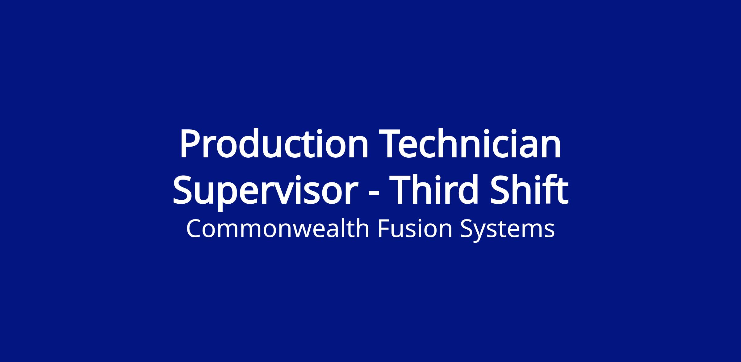 We're looking for experienced and highly motivated Production Supervisors to join Commonwealth Fusion Systems. The Production Supervisor role will be responsible for leading our high performing team consisting of a multitude of different technician and welding skill sets. The ideal candidate will have proven leadership experience, exceptional people skills, and a passion for always improving. They’ll be working cross functionally with other internal members to develop and manage production team members.