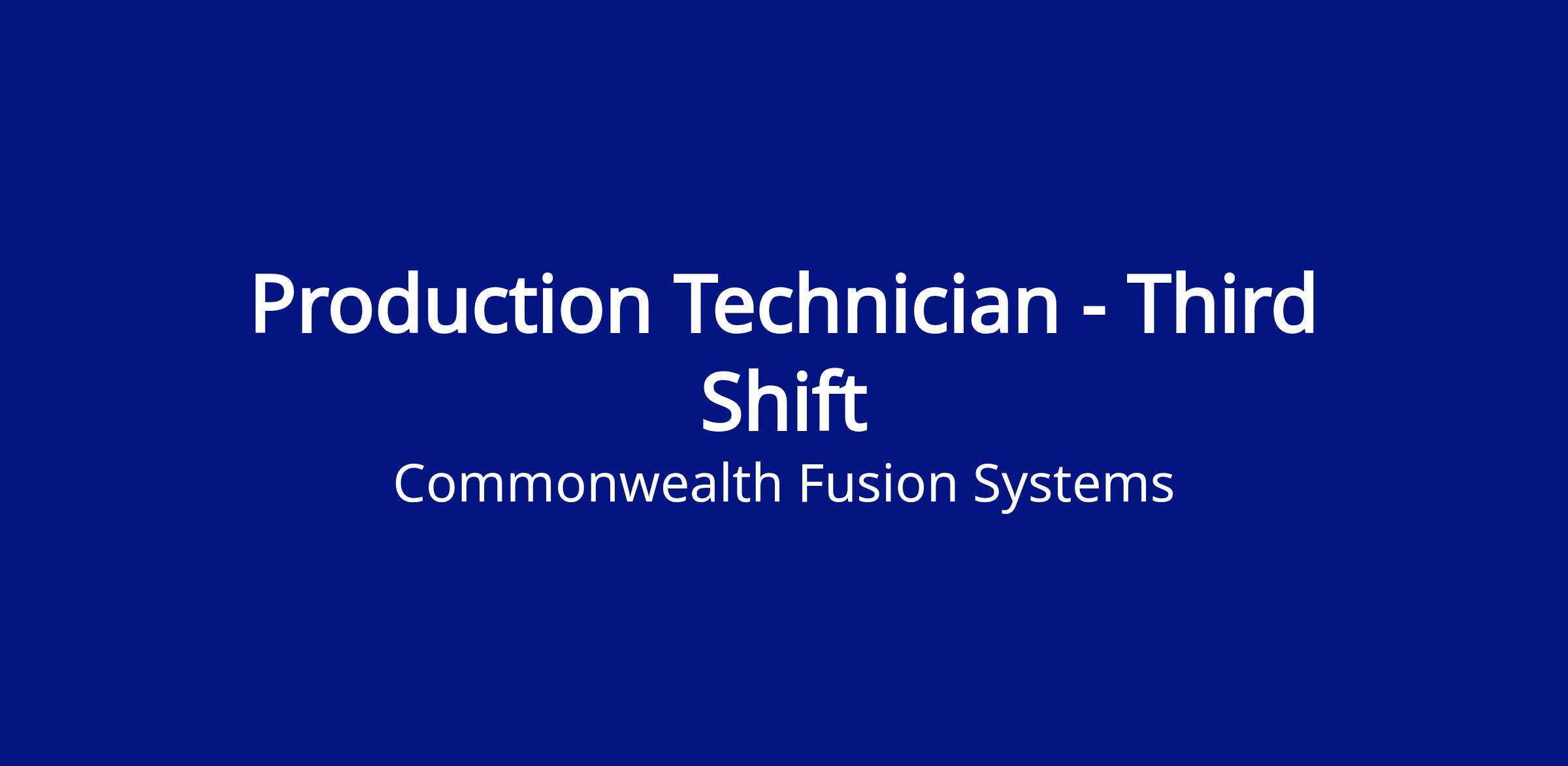 The production technician is an integral part of the CFS team performing and monitoring the manufacturing processes required to build and test superconducting magnets. You will have the opportunity to work within a fast-paced, exciting atmosphere to help the team meet the global necessity for clean energy. Ensures functional operation and preventative maintenance of equipment and continuous improvement. Responsibilities include close cooperation with Operations, Maintenance, Quality and other departments to ensure goals and objectives are met. This role will lead the way to making Earth sustainable for the future to come.