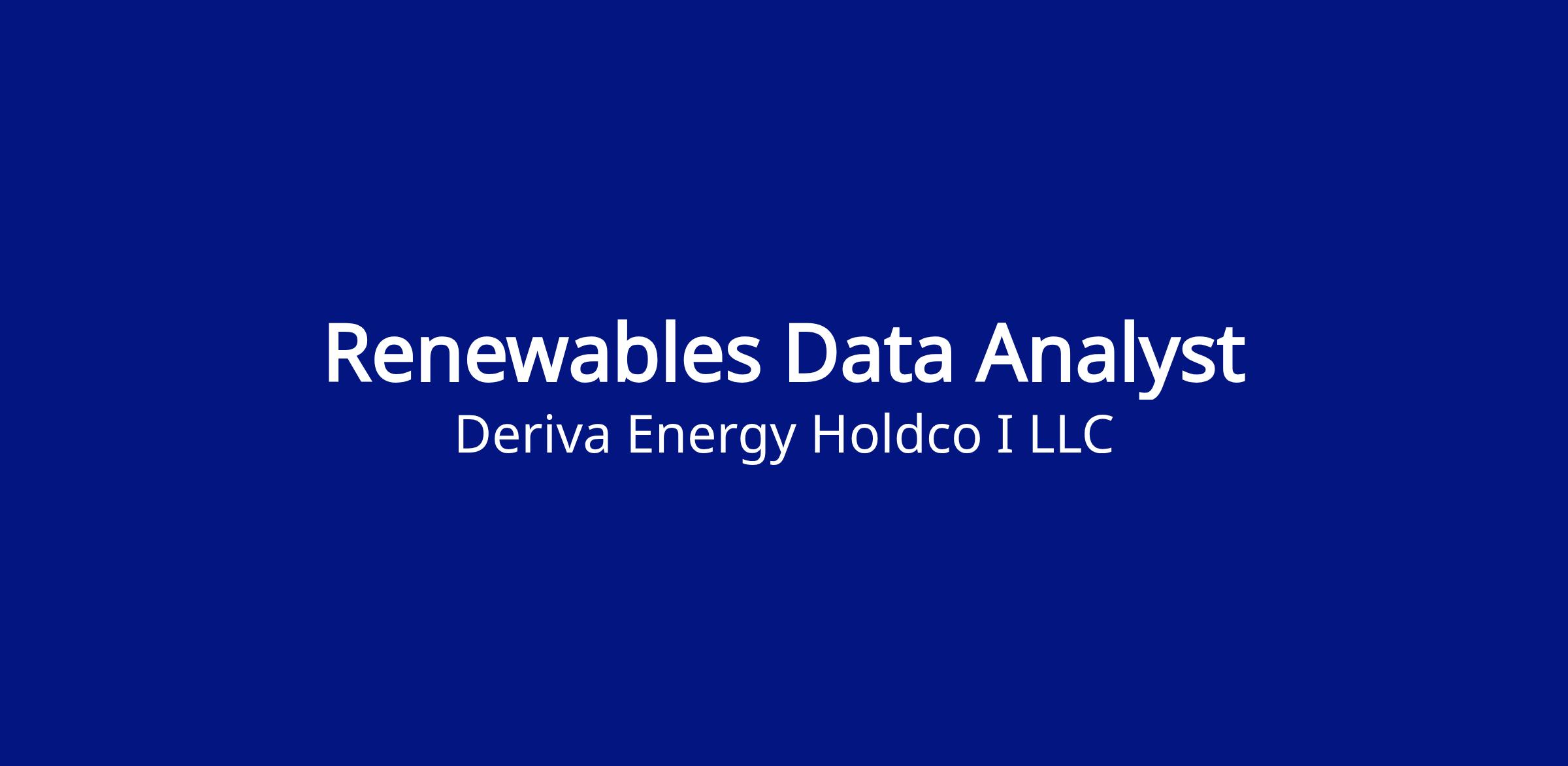 Deriva Energy is a leading Independent Power Producer in the US renewables market, with over 6 GW of operating or under construction wind, solar and storage projects across the country. Deriva’s ultimate parent is Brookfield Renewable and is poised for dynamic growth across its wind, solar, and storage portfolios. Join a dynamic team committed to excellence and innovation who envision a future of energy independence using resilient, carbon-free generation. We offer competitive compensation, comprehensive benefits, and the opportunity to make a significant impact in the rapidly evolving renewable energy industry. Deriva empowers customers with innovative clean energy solutions that strengthen communities and serve future generations.