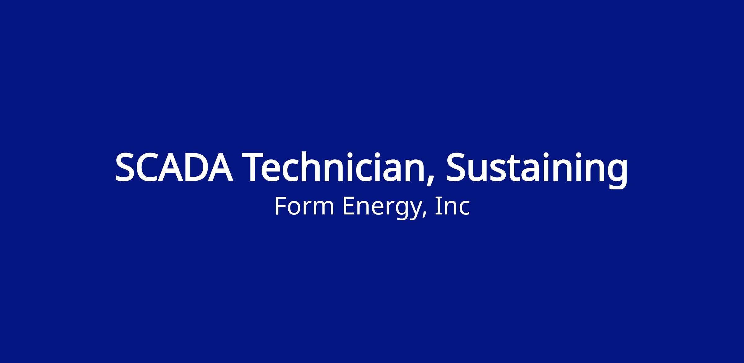 We are looking for an experienced SCADA technician to join the Manufacturing Control and Execution Systems - Sustaining team. In this role you will be responsible for both maintenance and continuous improvement of SCADA and HMI applications for novel equipment used to manufacture Form Energy’s Iron-Air battery. This role offers an exciting opportunity to be part of a mission critical team that owns control and execution systems throughout their lifecycle including design, development, deployment, and sustaining.