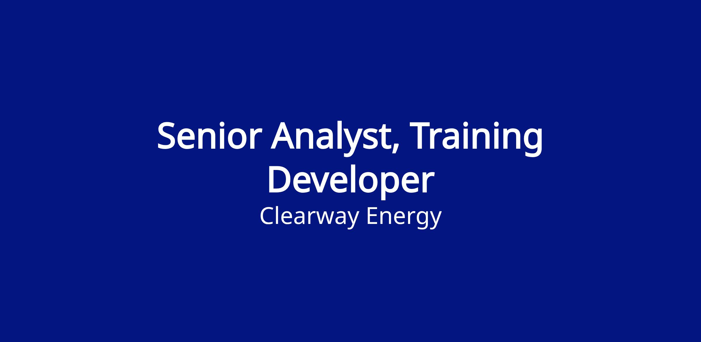 The Senior Analyst, Training Developer plays a supporting role in the design, development, and delivery of technical training programs for Clearway field technicians and other audiences. This position works under the guidance of senior team members, assisting with instructional design, content creation, and continuous improvement initiatives. The Senior Analyst, Training Specialist is focused on building foundational skills in instructional design and technical training, contributing to team projects, and learning best practices in the field.