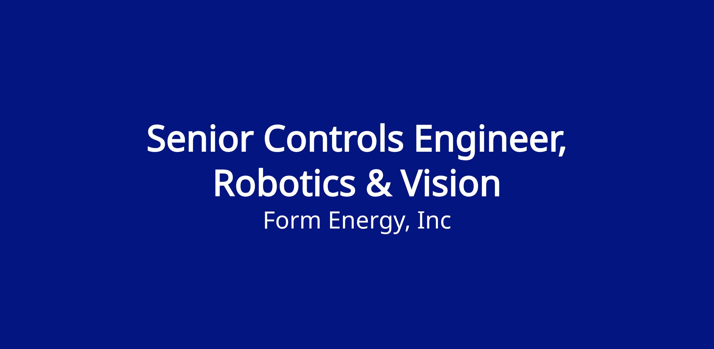 We are looking for a senior level controls engineer to join the Manufacturing Control and Execution Systems - Robotics & Vision team. In this role you will be responsible for design, development, and deployment of novel equipment used to manufacture Form Energy’s Iron-Air battery. This role offers an exciting opportunity to be part of a mission critical team that owns control and execution systems throughout their lifecycle including design, development, deployment, and sustaining.
