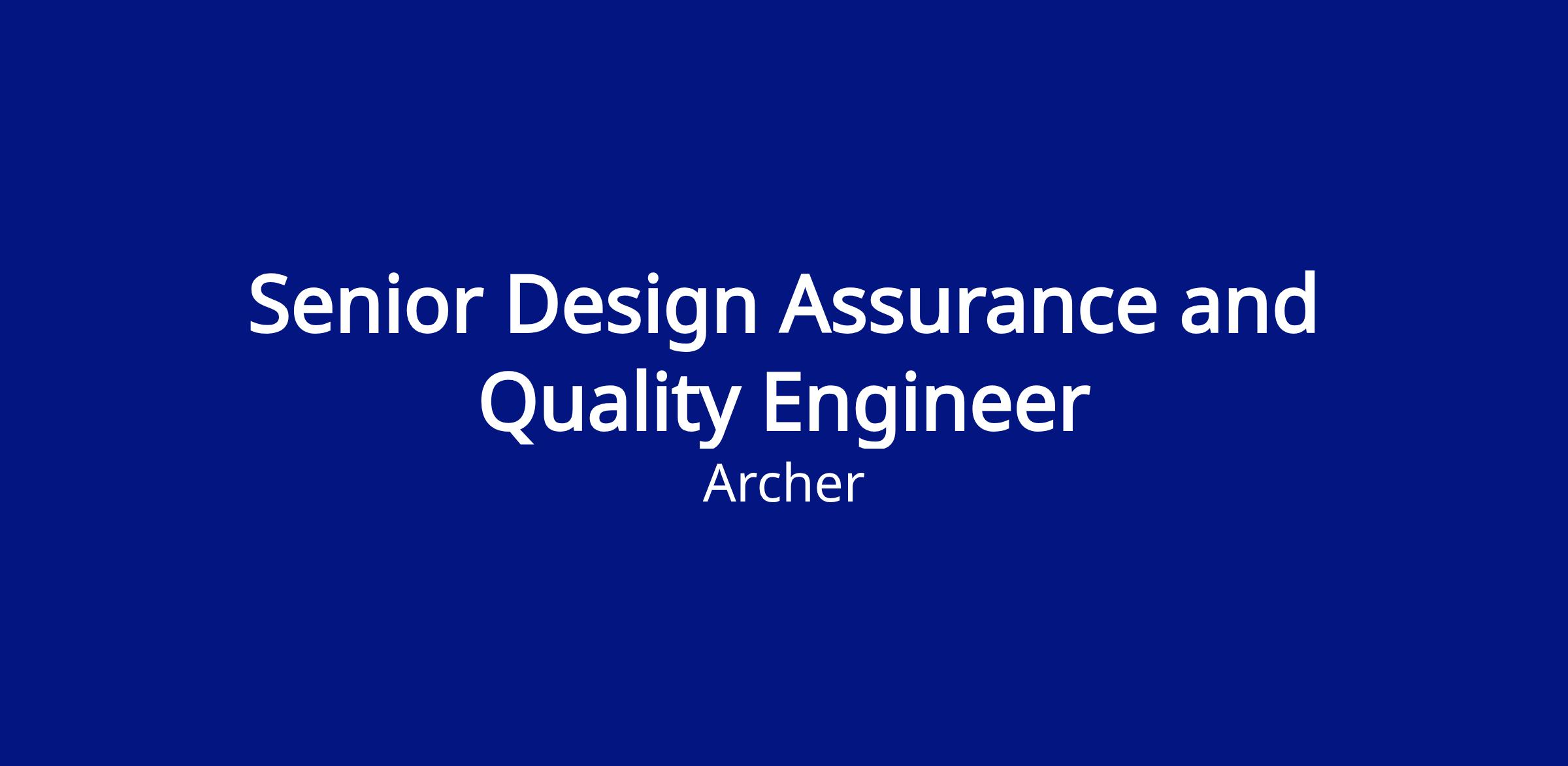 Archer Aviation does not engage with external recruiting agencies/individual recruiters with whom it does not have a prior written agreement. Archer reserves the right to make use of any unsolicited resumes that it receives and bears no responsibility for payment of any fees asserted from the use of unsolicited resumes. If you are a recruiting agency or individual recruiter wishing to do business with Archer, please reach out to People@archer.com. All employment processes are managed by the Archer People Team.