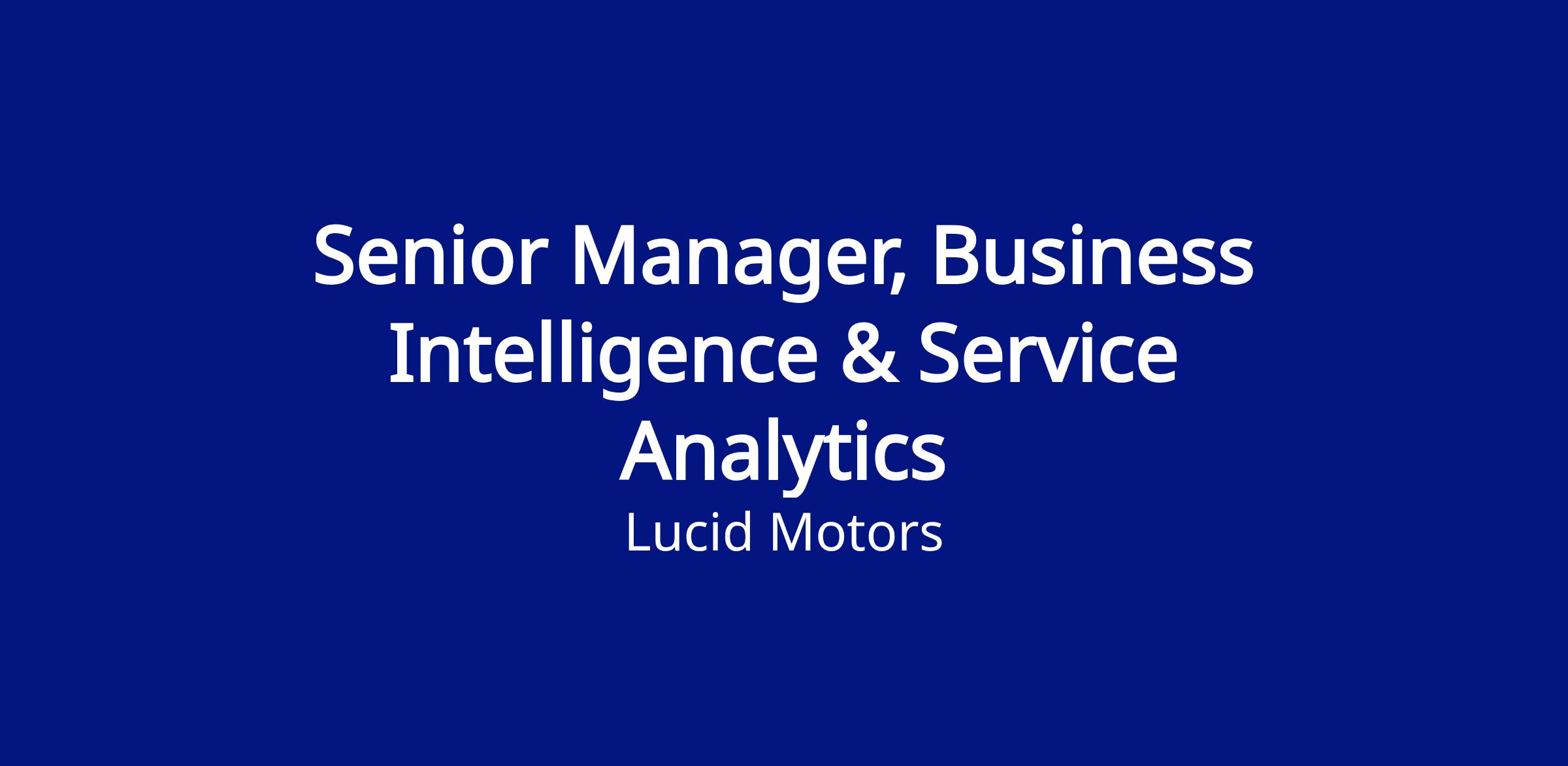 As a Senior Manager, Business Intelligence & Service Analytics, you will serve as a strategic thought leader in shaping how Lucid collects, analyzes, and operationalizes data across the entire customer ownership lifecycle. Your leadership will guide service centers, mobile service teams, parts operations, and customer care organizations in driving performance, scalability, and worldclass service excellence. You will own the long term analytics vision for Service and champion data driven decision making across the organization.