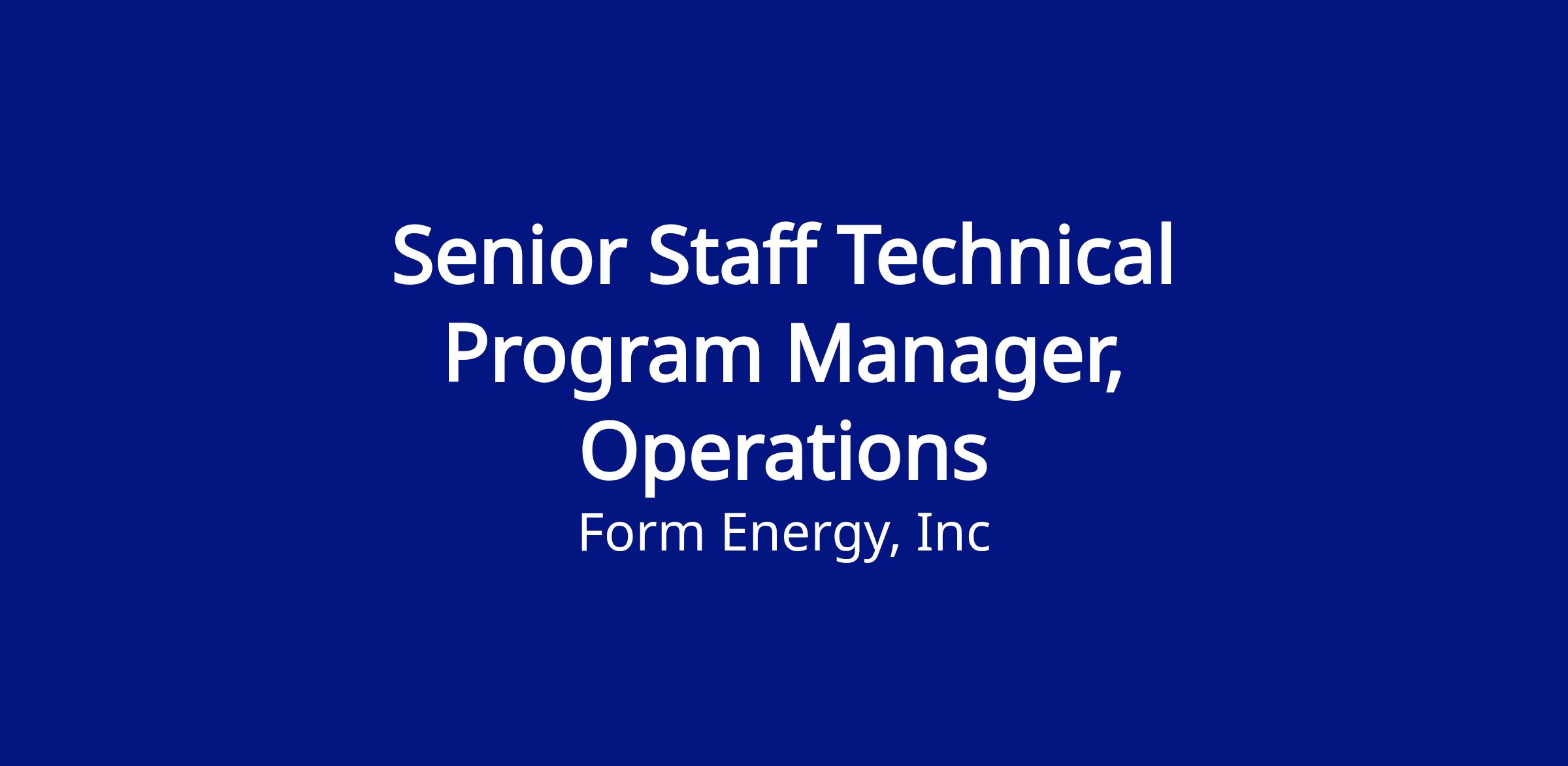 Form Energy is pioneering a new class of battery technology to transform the grid. We are seeking a Senior Staff Program Manager to lead the scaling of our iron-air battery production from early concept through high-volume production. In this role you will leverage your technical depth in new product introduction (NPI) and manufacturing to set the strategic direction for equipment design, process qualification, and scaling up our manufacturing systems. You will lead and develop a team of three Technical Program Managers while setting the execution cadence, operating mechanisms, and decision frameworks that enable scalable, repeatable manufacturing. This is a chance to have a direct, hands-on impact on scaling up revolutionary, multi-day energy storage technology.