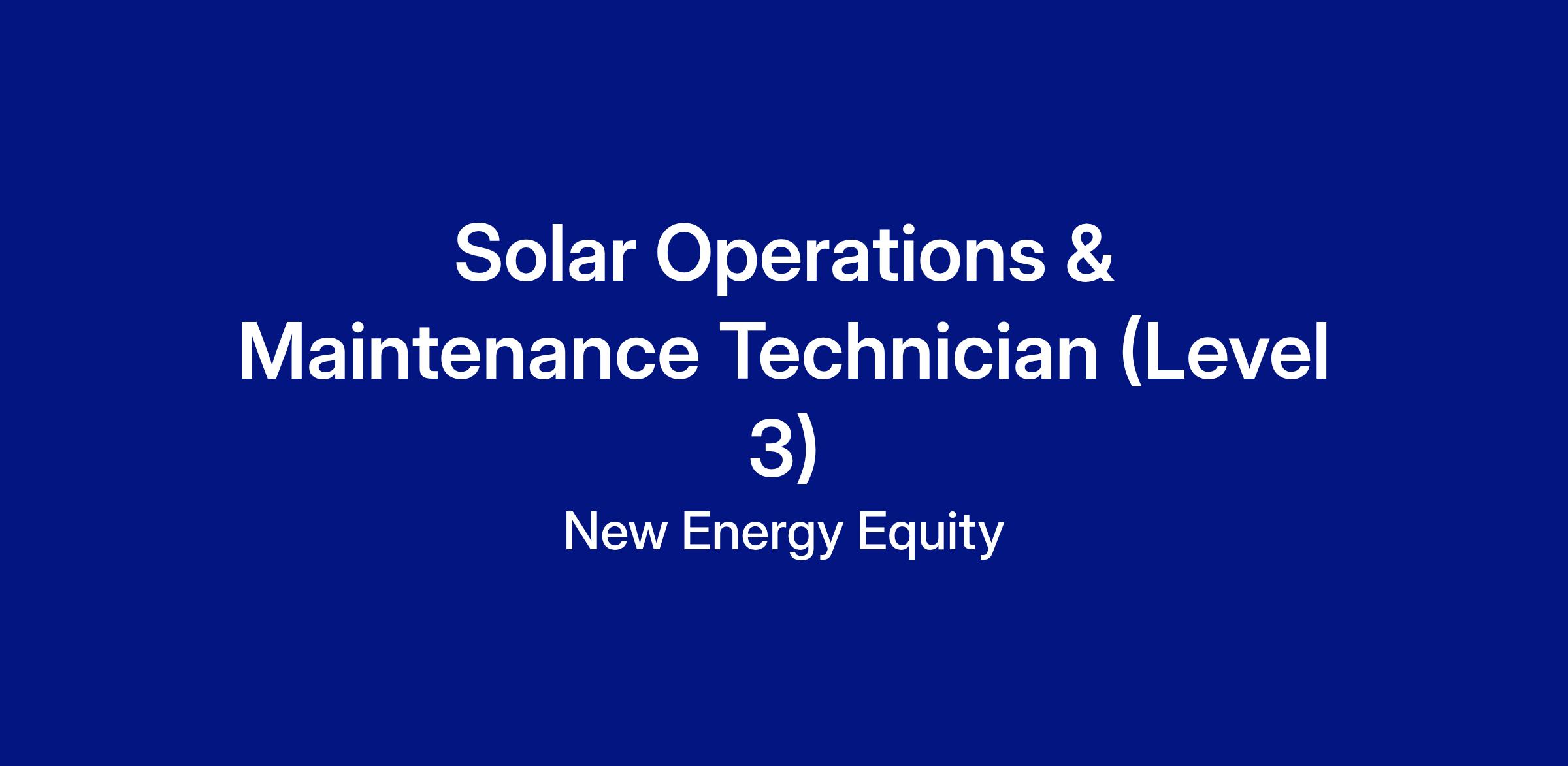 Are you a skilled electrician with a passion for renewable energy? Do you enjoy troubleshooting complex systems and working outdoors? Join Energy Support Services, a subsidiary of New Energy Equity, as an O&M Technician Level 3! In this role, you’ll lead complex inspections, troubleshooting, and repairs on solar energy systems. As a technical expert, you'll provide guidance and training to junior technicians while ensuring our solar projects operate at peak efficiency. If you’re passionate about renewable energy and ready to make an impact, we want to hear from you. Join us and help drive the future of clean energy! A $3,000 sign-on bonus is available to new hires who meet all eligibility requirements!