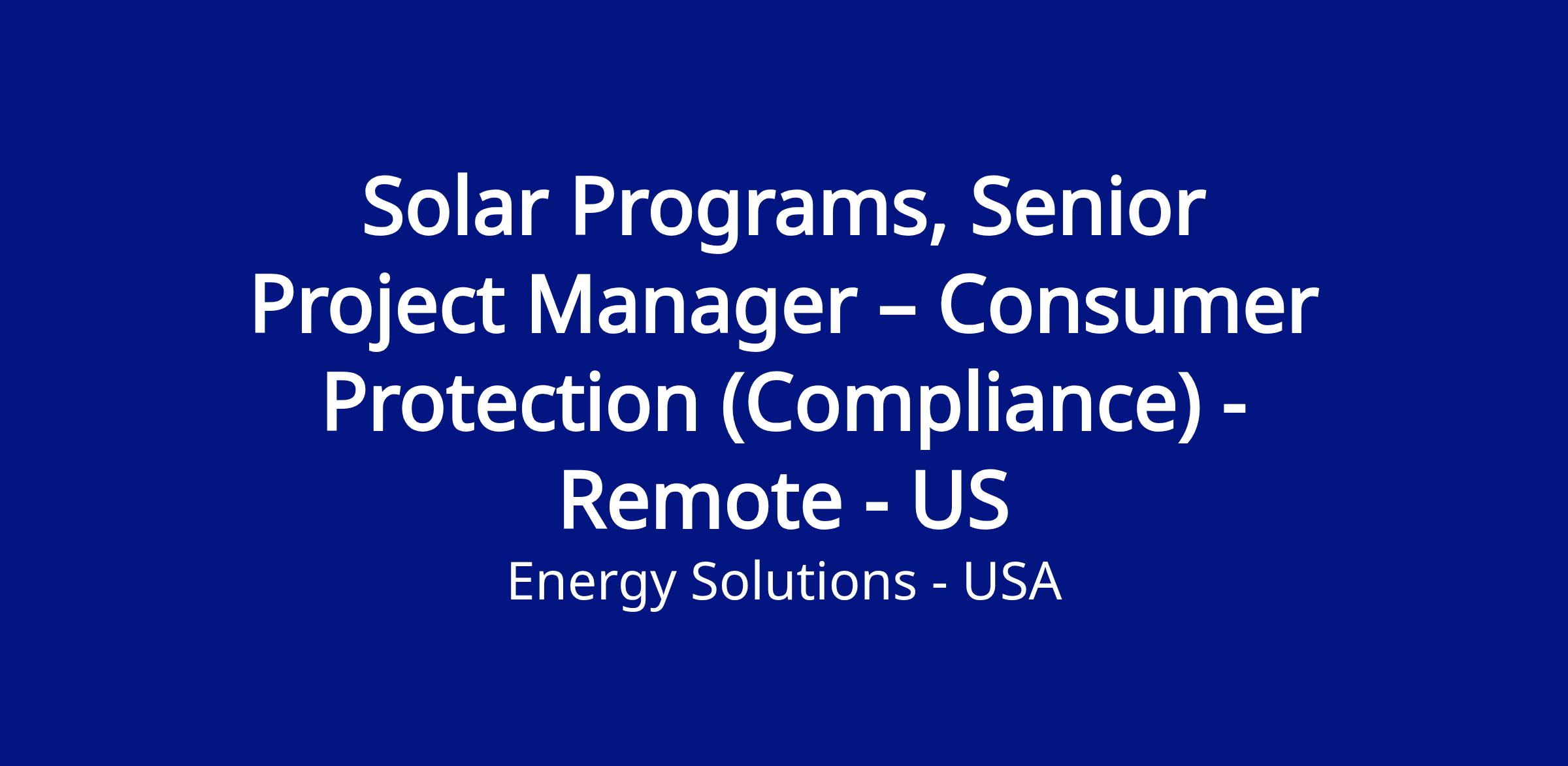 We are currently seeking a Solar Programs, Senior Project Manager - Consumer Protection (Compliance) to join our Distributed Energy Resources (DERs) Department. As a member of the DERs Department, you will assist with driving customer participation in programs that incentivize the adoption of distributed and community solar. Solar energy is critical in driving our nation’s progress toward a decarbonized grid, and you will play a material role in helping our team make this future a reality.