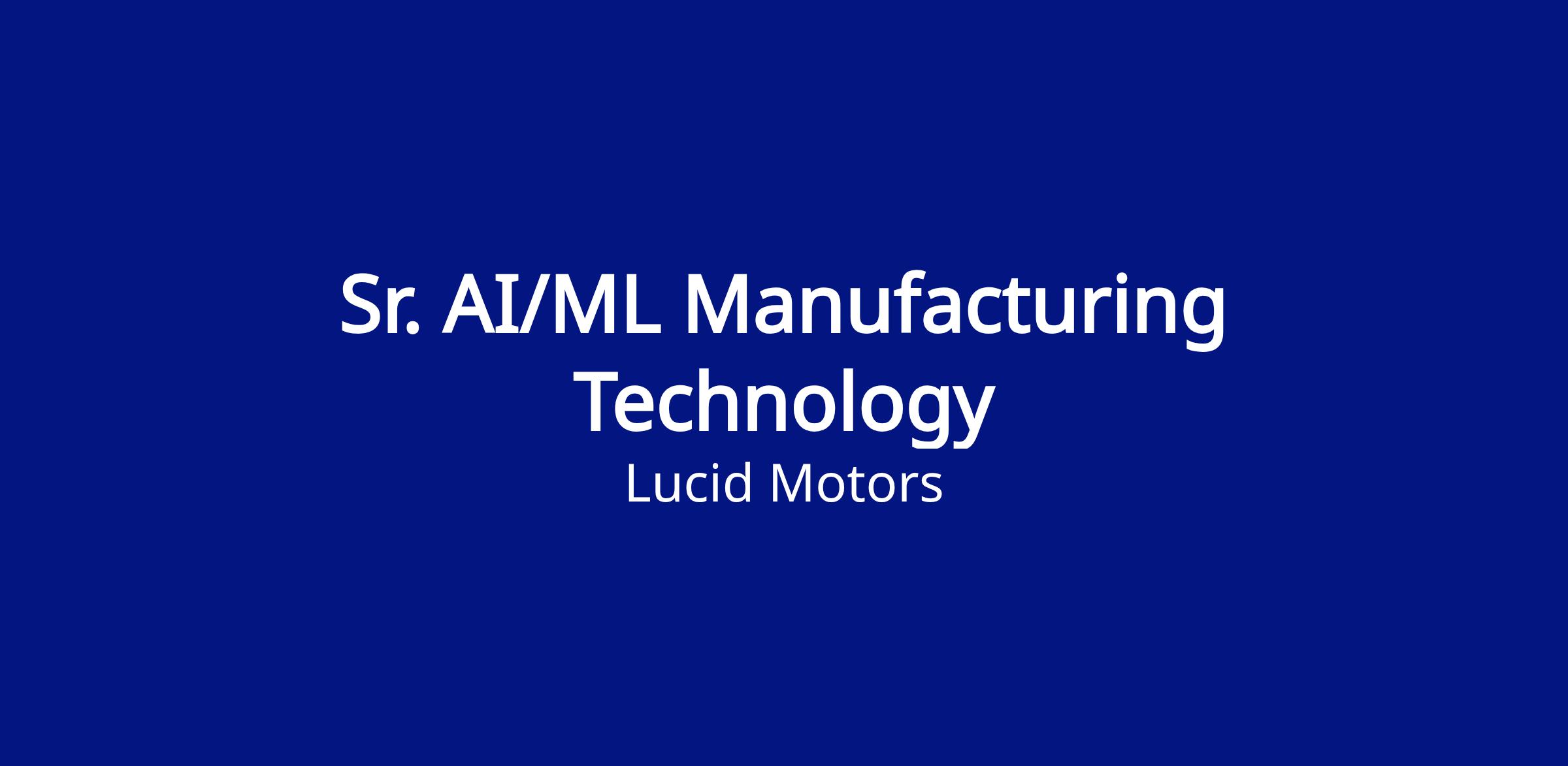 Lucid’s mission is to inspire the adoption of sustainable energy by creating the most captivating luxury electric vehicles, centered around the human experience. Working at Lucid Motors means having a shared vision to power the future in revolutionary ways. Be part of a once-in-a-lifetime opportunity to transform the automotive industry. Data generated by electric vehicles is rich and diverse with a lot of potential to design, develop, and deploy AI/ML solutions to drive leading innovation and AI product solutions on part with Lucid’s industry leadership and brand expectations. Lucid’s AI/ML organization is seeking a Sr. AI/ML, Manufacturing Technology focused on AI/ML for manufacturing processes, data intelligence, physical AI and automation. This position requires applied machine learning experience with deep expertise in Generative AI, Large Language Models, Natural Language Processing, Retrieval-Augmented Generation, Agentic workflows, and Autonomous Systems.