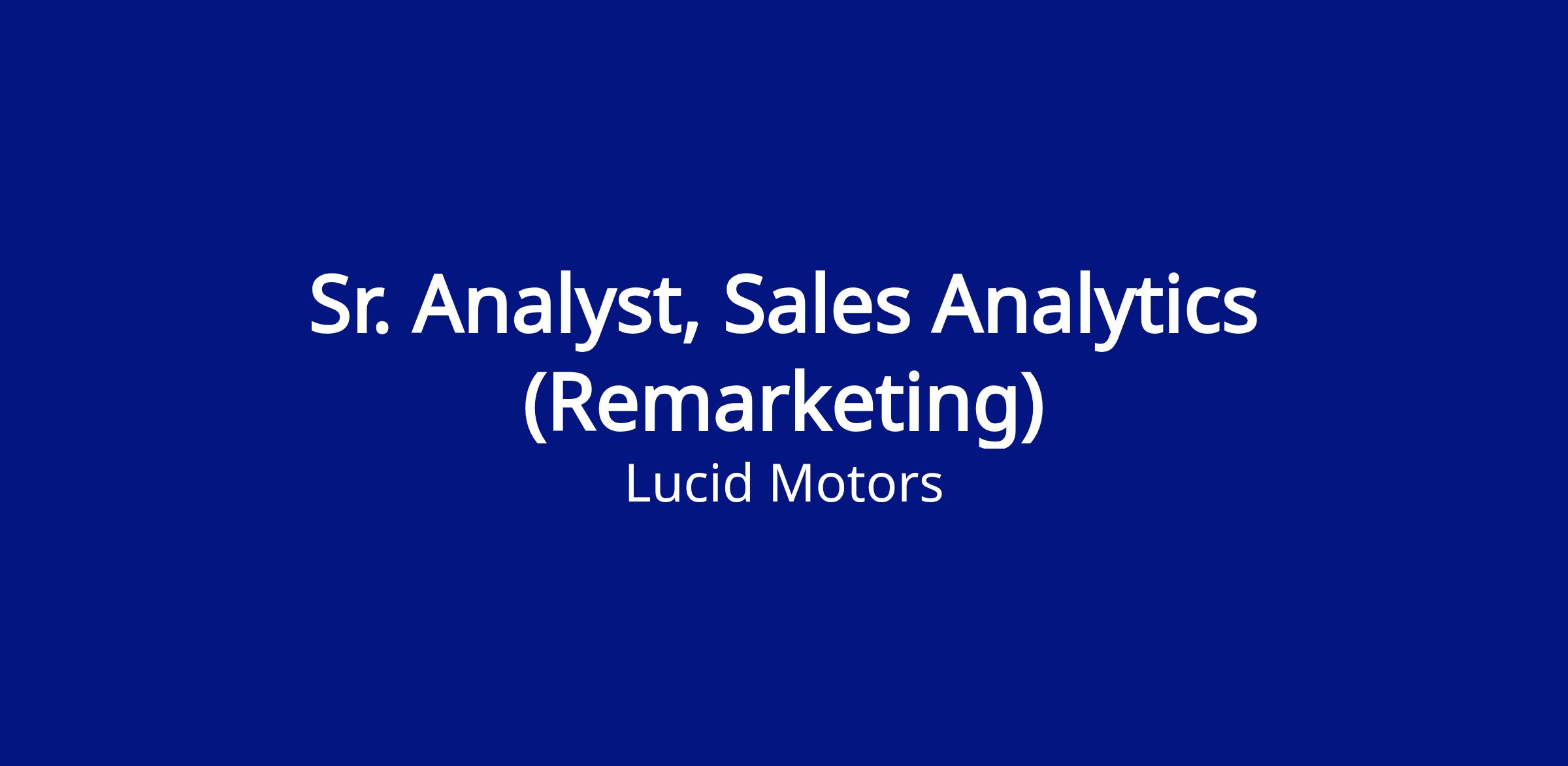 We are seeking an experienced and highly motivated Senior Data Analyst focused on Remarketing. We are looking for someone who can partner with Lucid’s Remarketing team and harness data to generate insights and accelerate decision making. This role requires a blend of technical and business skills. You will have a unique opportunity to build from 0 to 1 and have broad exposure across many functions. The ideal candidate has a passion for transforming raw data into useful insights and will take pride in building a world-class data-driven remarketing organization.