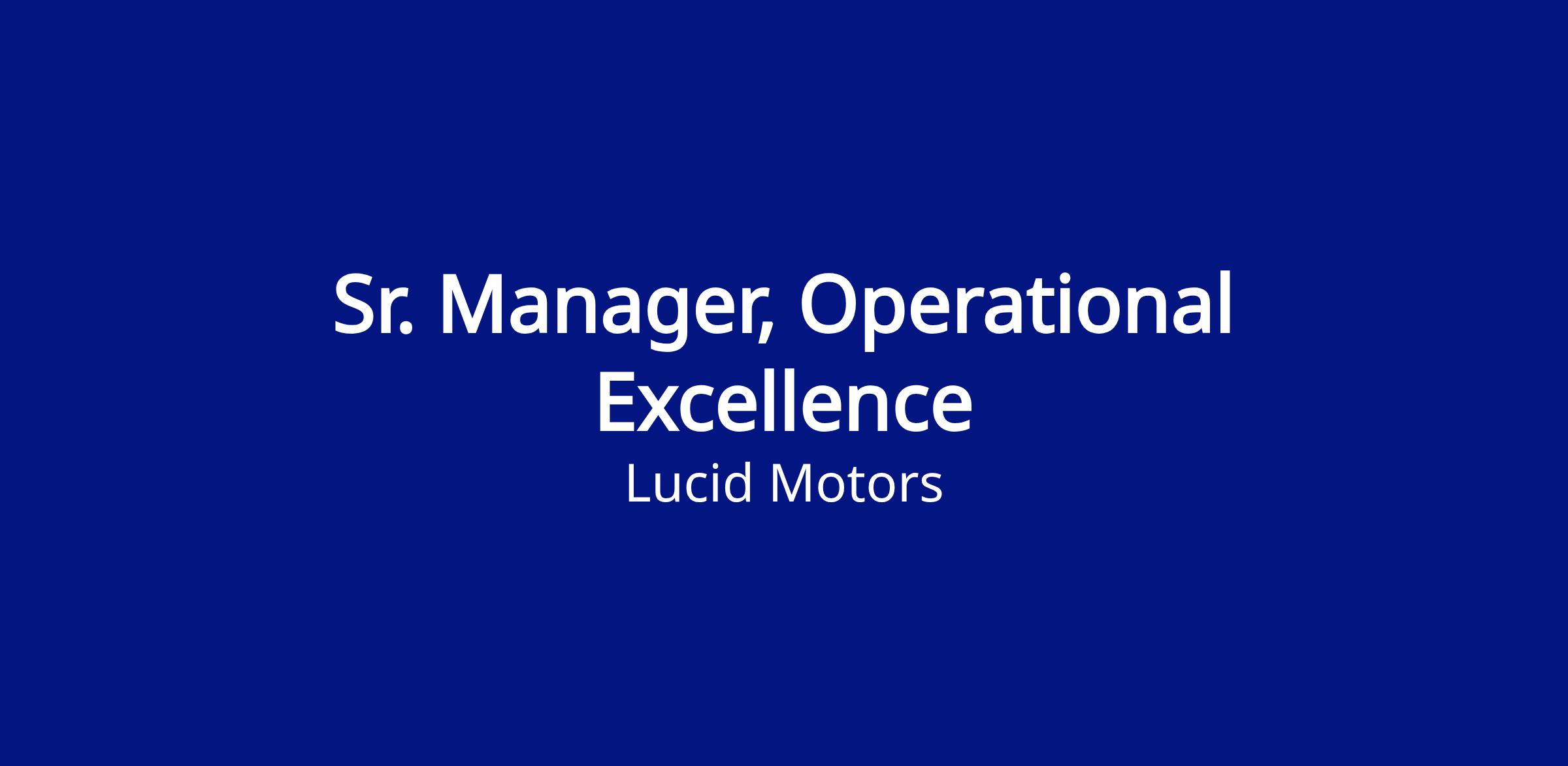 The Sr. Manager, Operational Excellence will report to the Director of Operations and will be responsible for leading the strategic deployment of Lucid Production System (LPS) principles across all manufacturing operations. This role will drive enterprise-level continuous improvement initiatives, oversee critical programs such as MRB governance, and lead cross-functional teams to achieve world-class performance in safety, quality, delivery, and cost. The Sr. Manager will act as a change agent, fostering a culture of Lean thinking and operational excellence throughout the organization. Continuous improvement initiatives, oversee critical programs such as MRB governance, and lead cross-functional teams to achieve world-class performance in safety, quality, delivery, and cost. The Sr. Manager will act as a change agent, fostering a culture of Lean thinking and operational excellence throughout the organization continuous improvement initiatives, oversee critical programs such as MRB governance, and lead cross-functional teams to achieve world-class performance.
