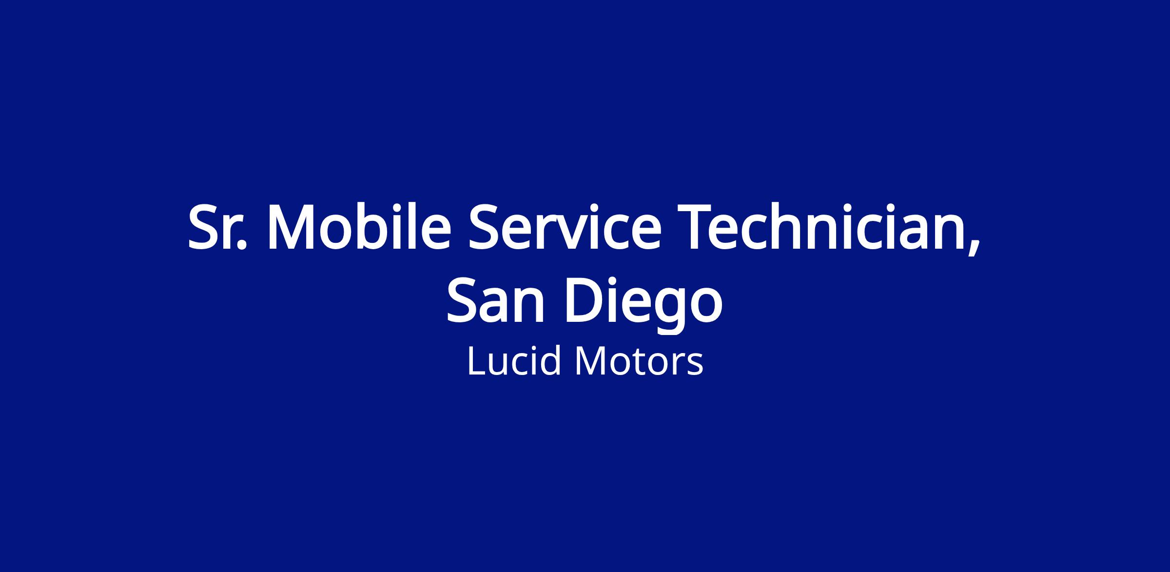The Sr. Mobile Service Technician is a unique position that covers field service repairs. This position would be responsible for traveling to client locations and will be responsible for diagnosing, maintaining and repairing Lucid Motors vehicles in the field. Lucid provides Mobile Service Technicians with a service van or truck and provides the needed tools. This fixed operation position will work independently as well as a team where you will have the support of the closet service location. You will demonstrate your passion for sustainable transportation and creatively solve problems in a fast-paced environment.