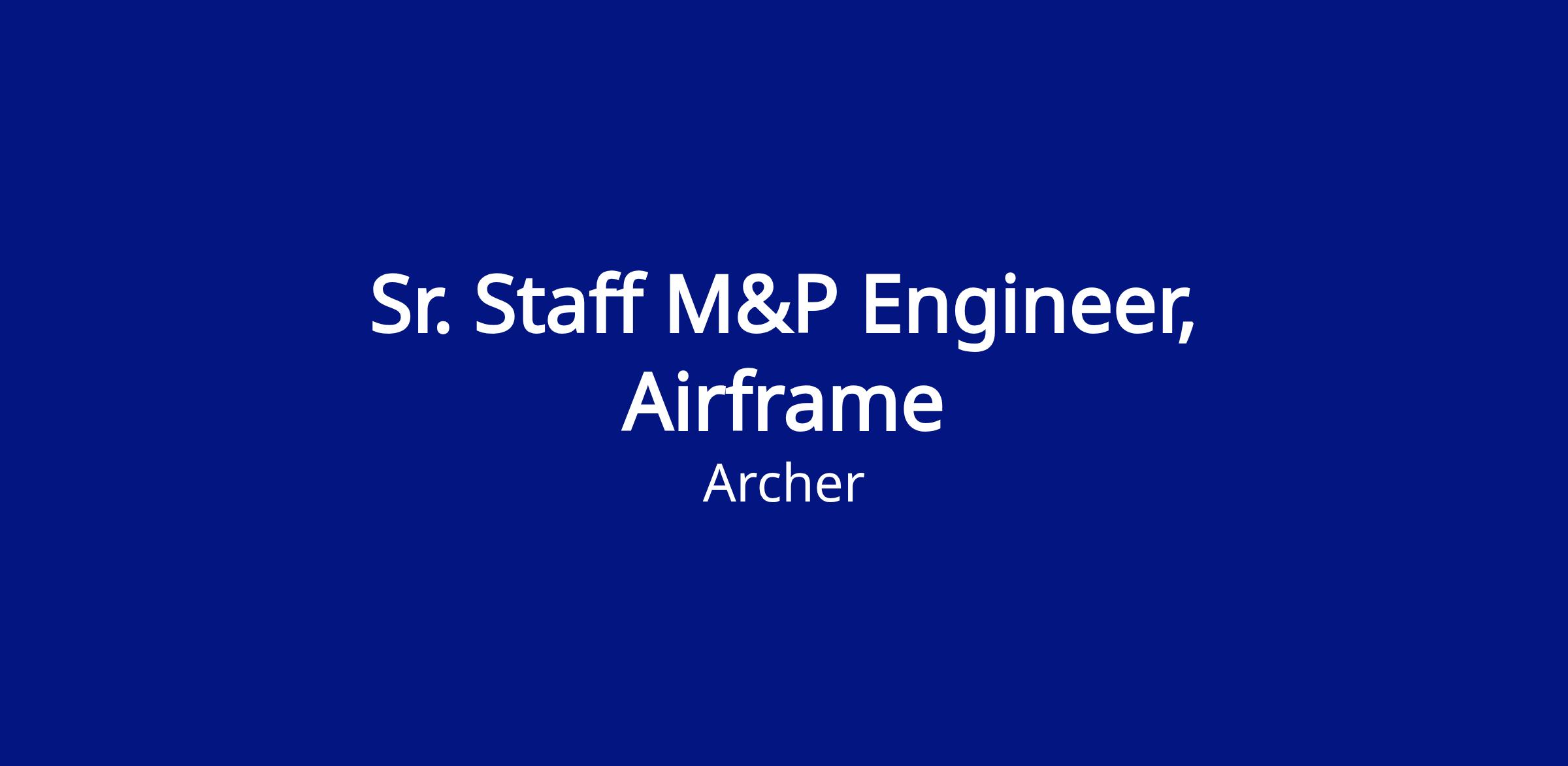 Archer Aviation does not engage with external recruiting agencies/individual recruiters with whom it does not have a prior written agreement. Archer reserves the right to make use of any unsolicited resumes that it receives and bears no responsibility for payment of any fees asserted from the use of unsolicited resumes. If you are a recruiting agency or individual recruiter wishing to do business with Archer, please reach out to People@archer.com. All employment processes are managed by the Archer People Team.