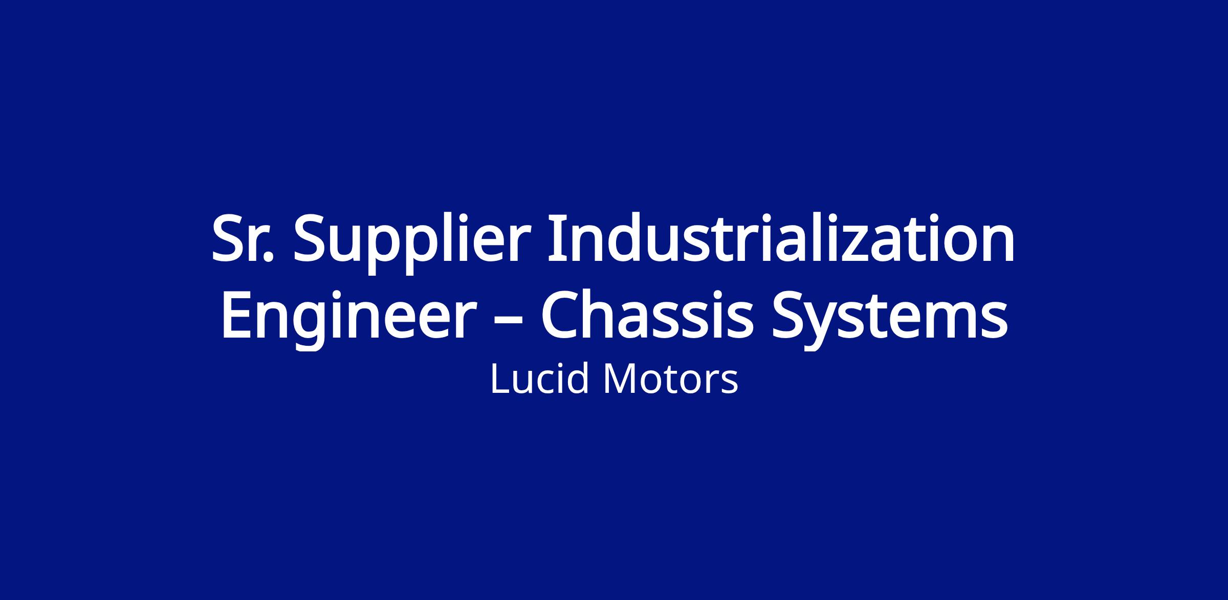 Lucid is seeking a Senior Supplier Industrialization Engineer - Chassis Systems - to drive best-in-class product quality throughout the development process. This high-visibility role demands technical expertise, strong interpersonal skills, and the ability to excel in a complex, fast-paced environment. Our Corporate Supplier Industrialization team empowers the rapid industrialization of innovative products. The Senior Supplier Industrialization Engineer collaborates with cross-functional teams and suppliers to balance design innovation with robust manufacturing for optimal quality.