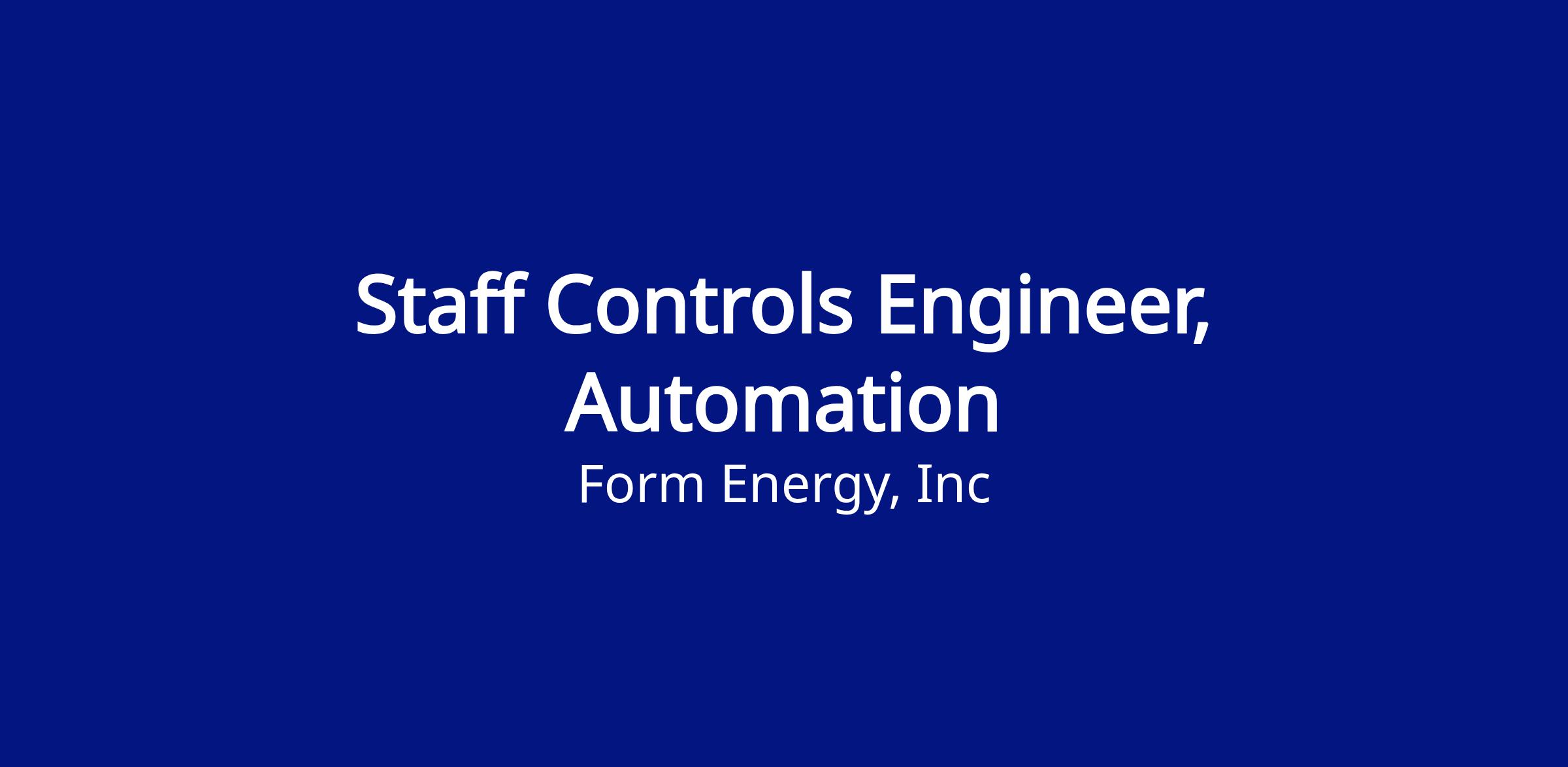 We are looking for a staff level controls engineer to join the Manufacturing Control and Execution Systems - Automation team. In this role you will be responsible for design, development, and deployment of novel equipment used to manufacture Form Energy’s Iron-Air battery. This role offers an exciting opportunity to be part of a mission critical team that owns control and execution systems throughout their lifecycle including design, development, deployment, and sustaining.