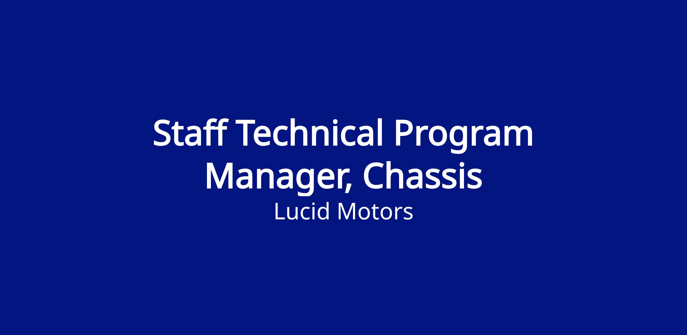 The Chassis team is looking for a Staff Technical Program Manager (SET Lead). The Chassis group is responsible for parts such as: steering, wheels, tires, brakes, structures, and vehicle dynamics.