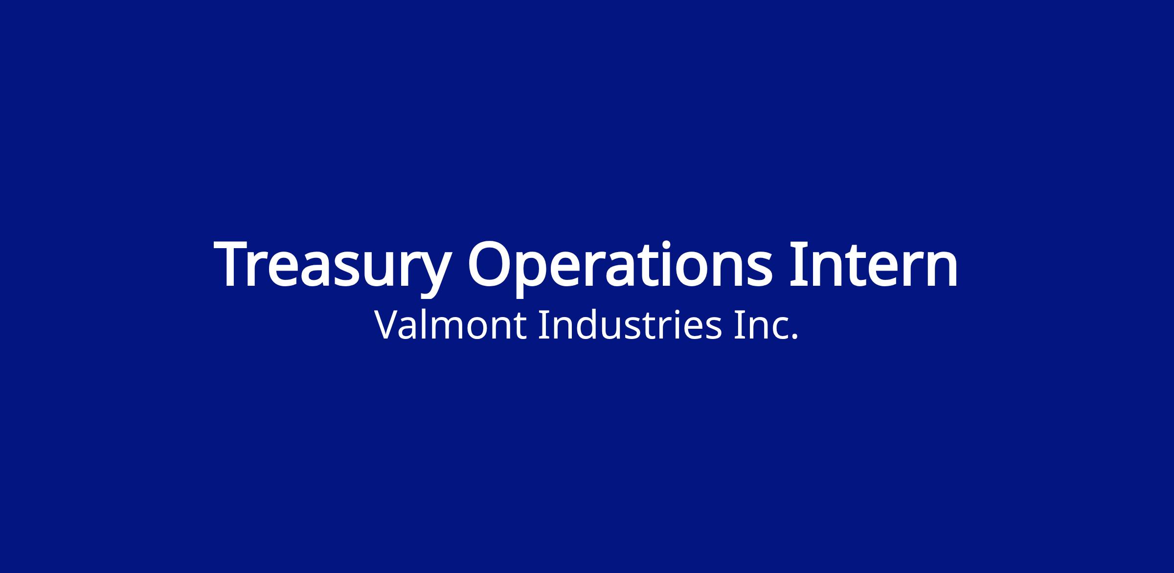 Valmont’s internship program mission is to enable an emerging workforce to advance the success of Valmont’s global operations. We do this through recruiting and retaining top talent, providing opportunities for professional development through mentorship, and involving them in real-world projects alongside practical coaching. This internship will provide experience to create, standardize, and maintain the Treasury Operations Center of Excellence.