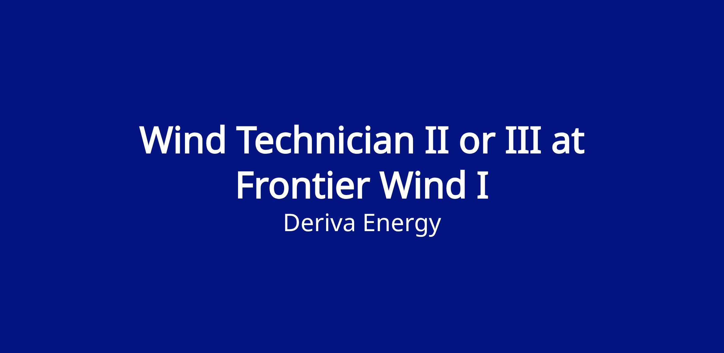 Internal Candidates - In addition to the High School/GED requirement, (3+) year of technical experience with Deriva Energy as a Wind Technician. Must also have Turbine Technician II and Electrical Operator II JPM completed